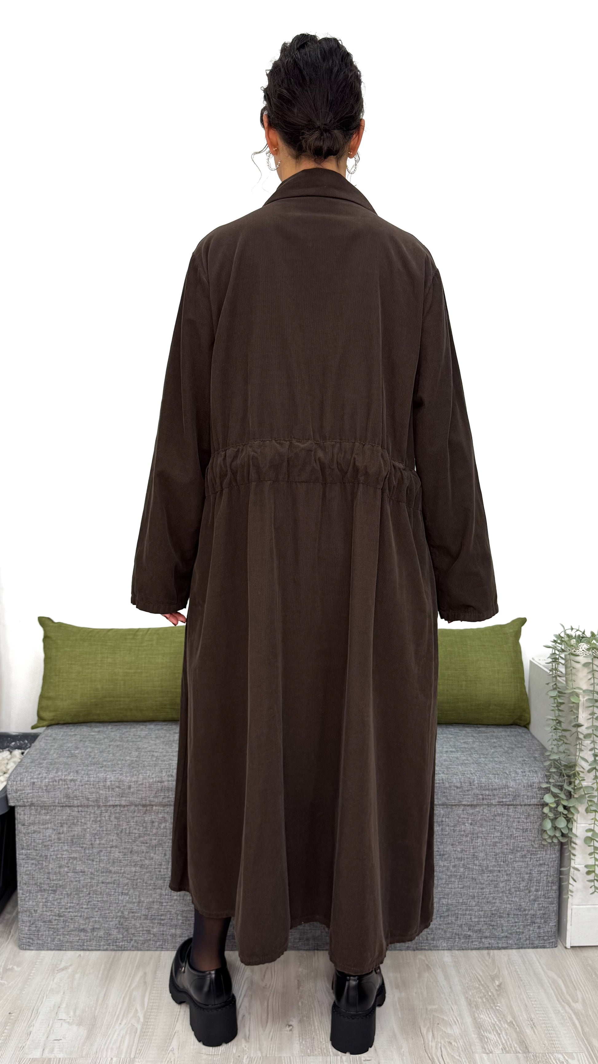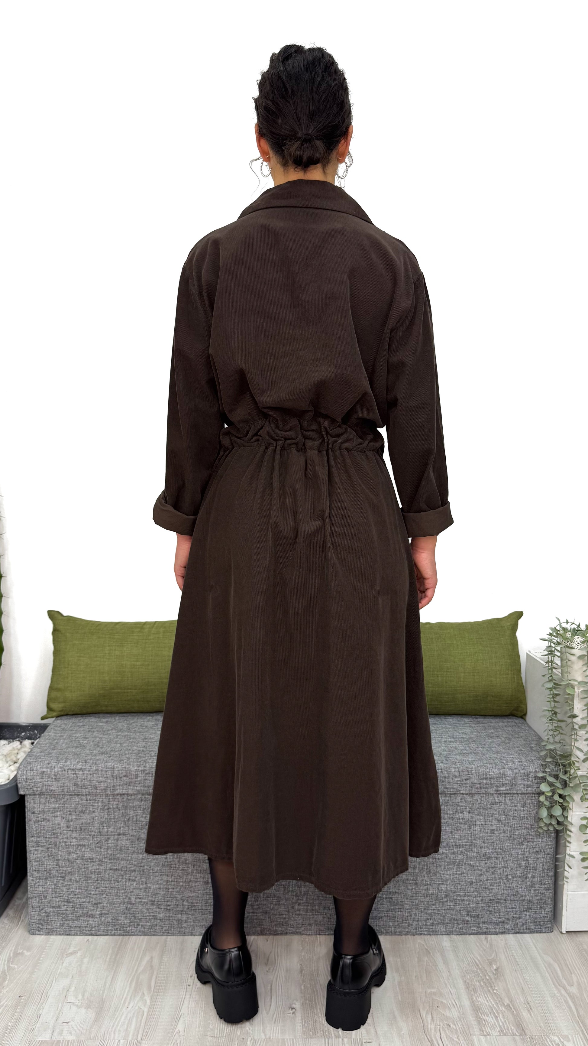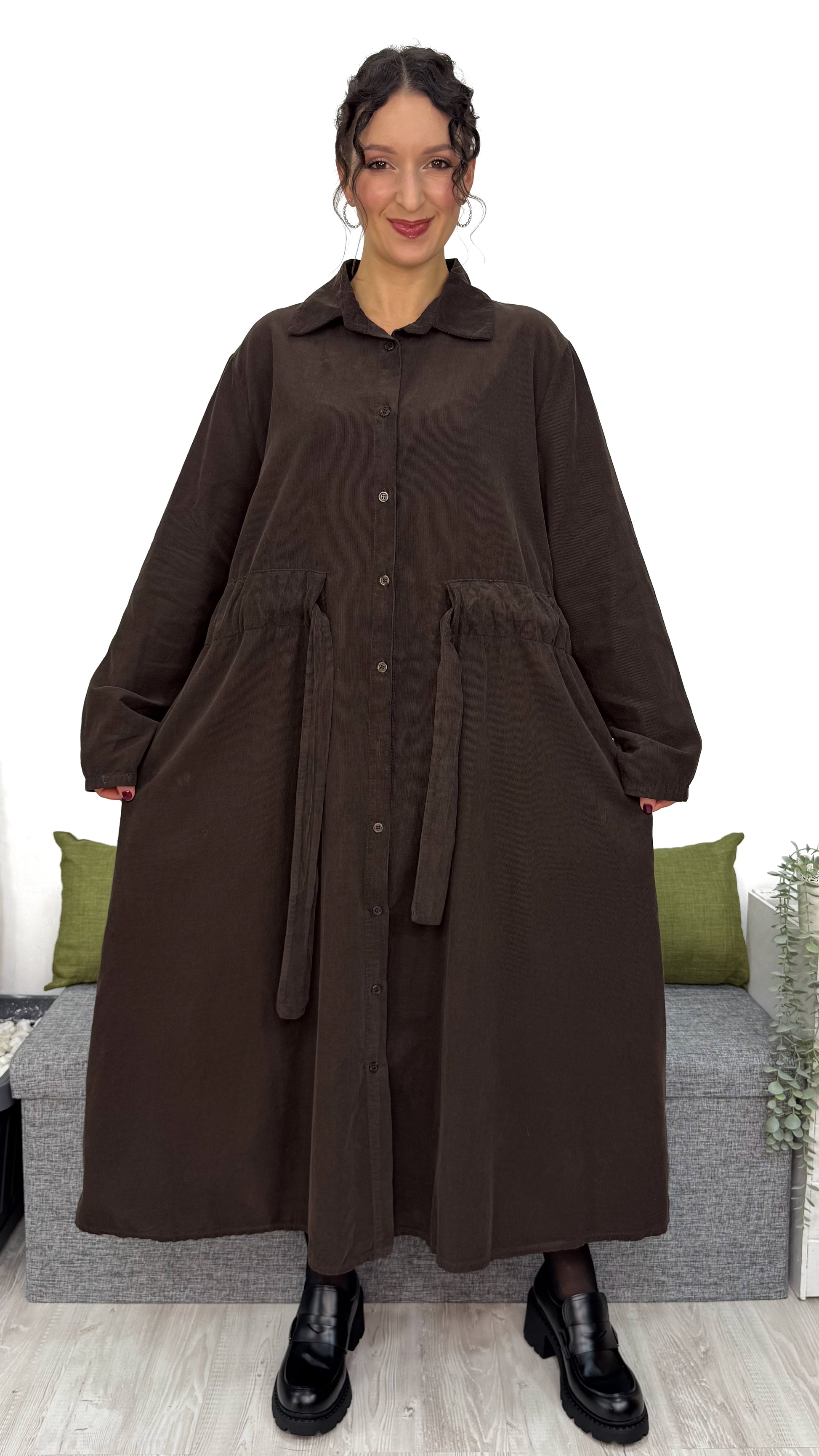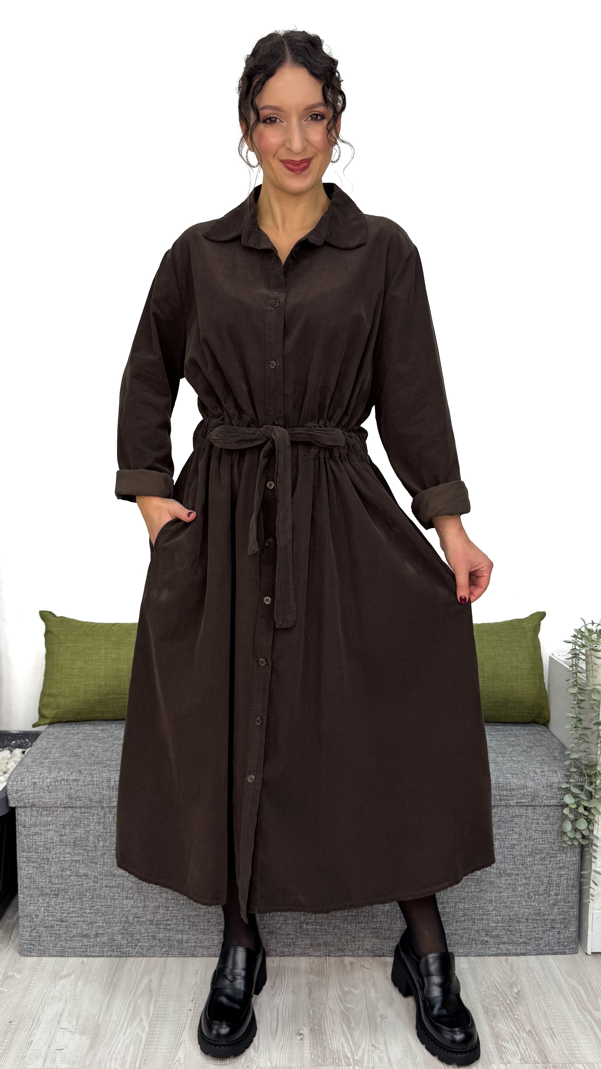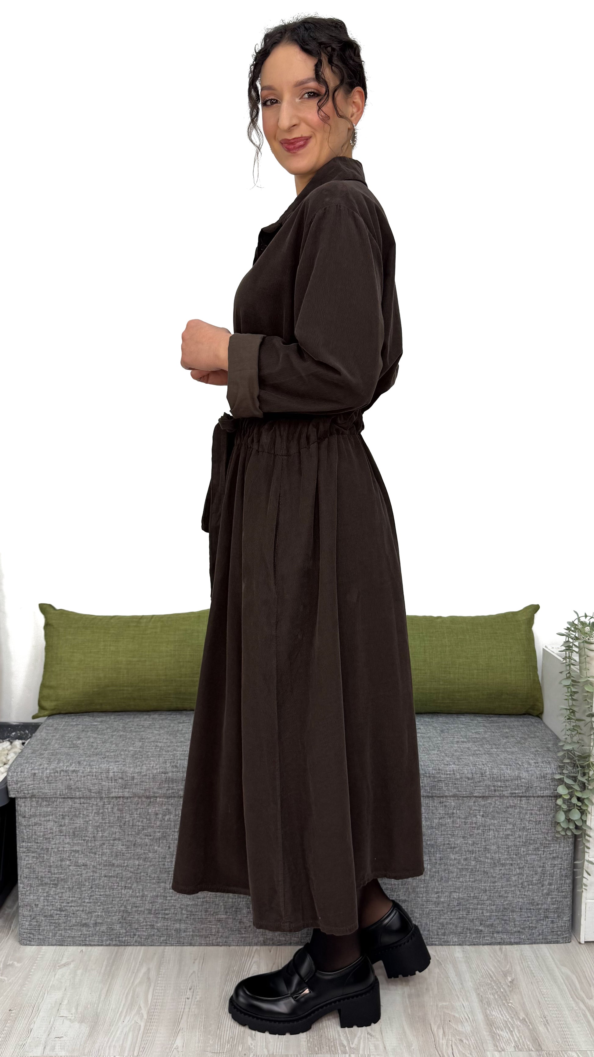 L‘ABITO CHEMISIER è pensato per farti sentire comoda e valorizzata allo stesso tempo. La linea ampia scende morbida sul corpo, mentre il velluto in cotone dona calore, eleganza e una sensazione piacevole sulla pelle.