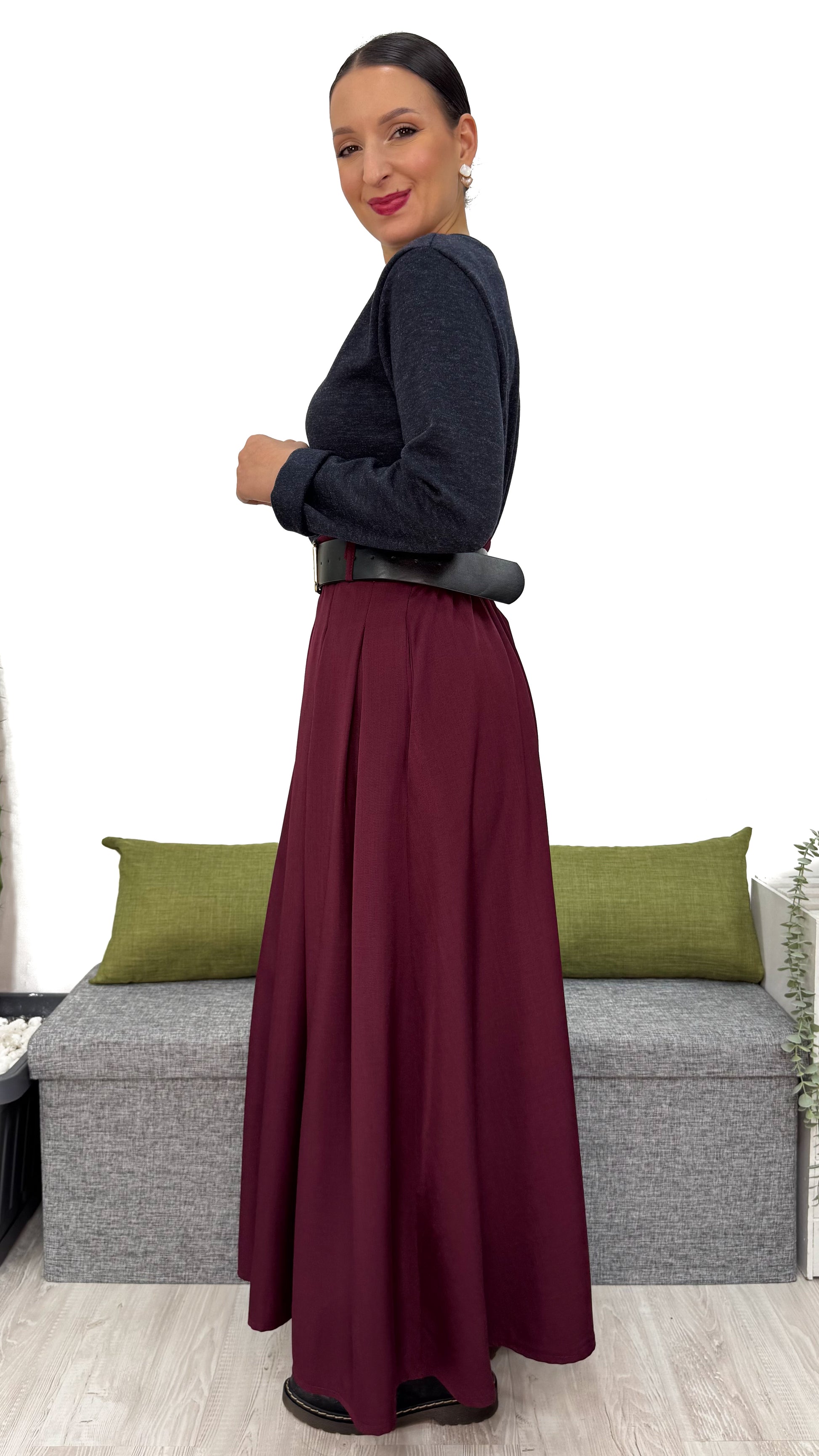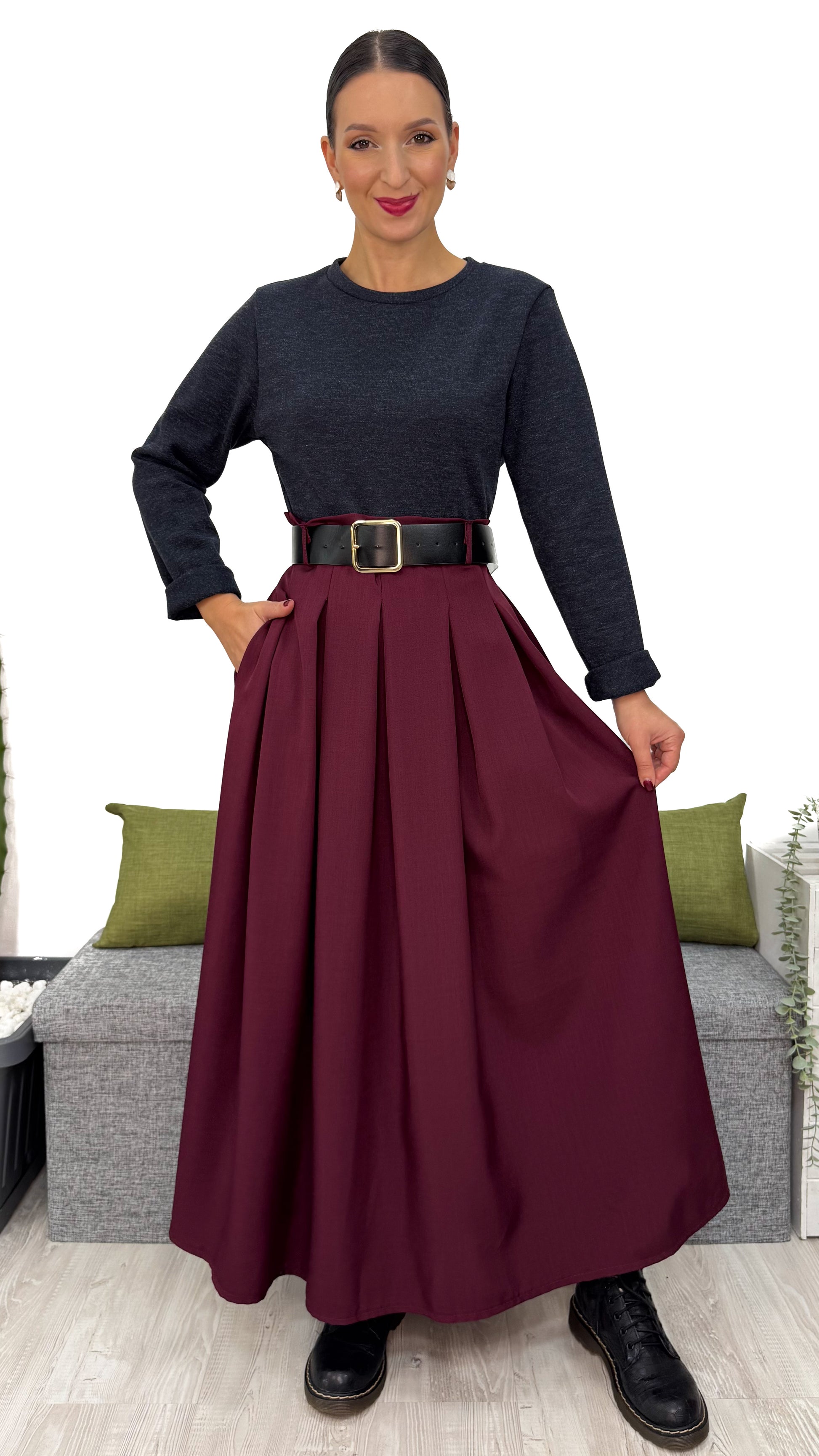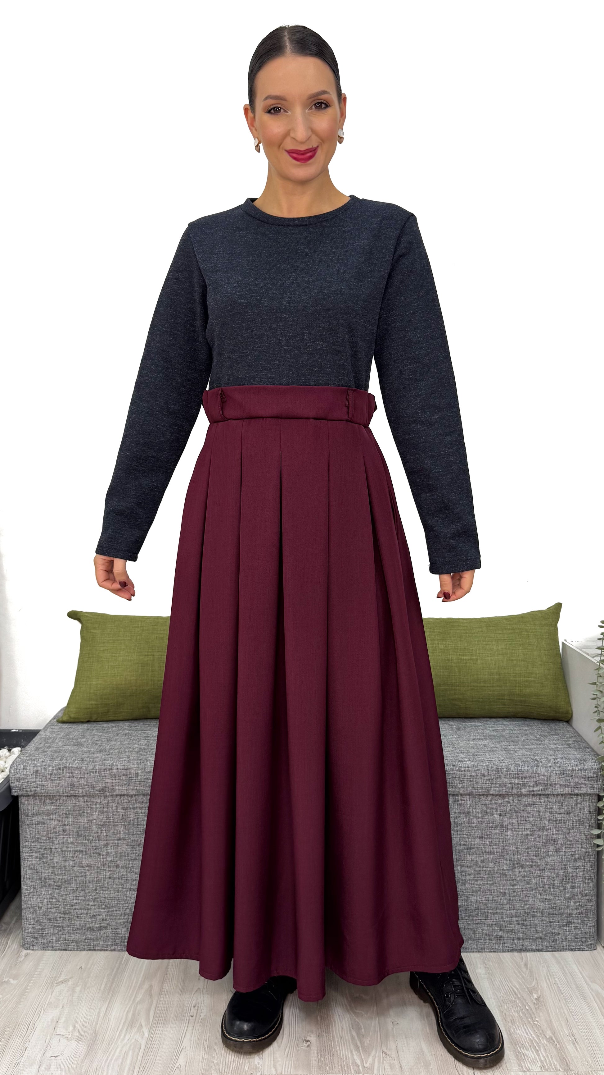 - La parte inferiore è una gonna lunga in tessuto sartoriale, con effetto pieghe, vita a caramella con elastico e passanti, e cintura coordinata inclusa.