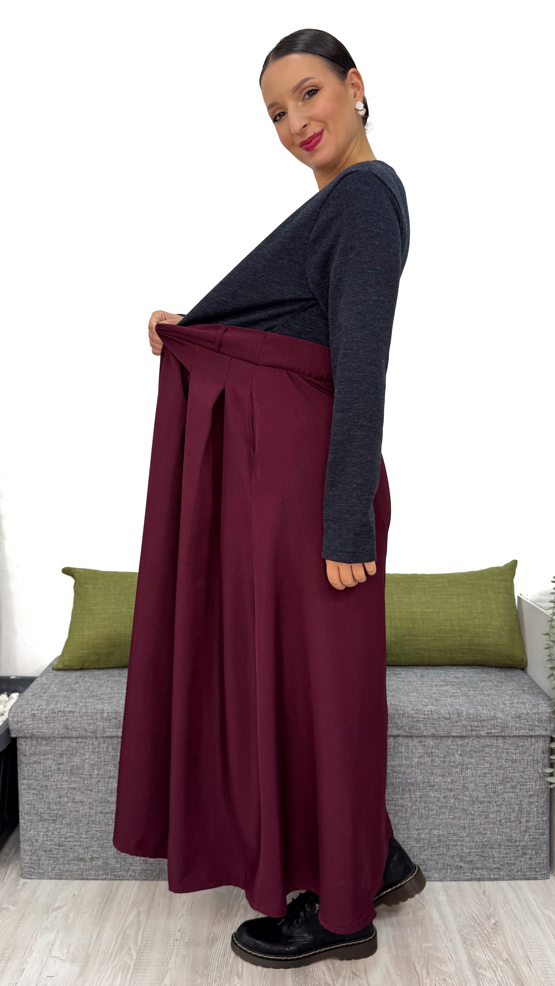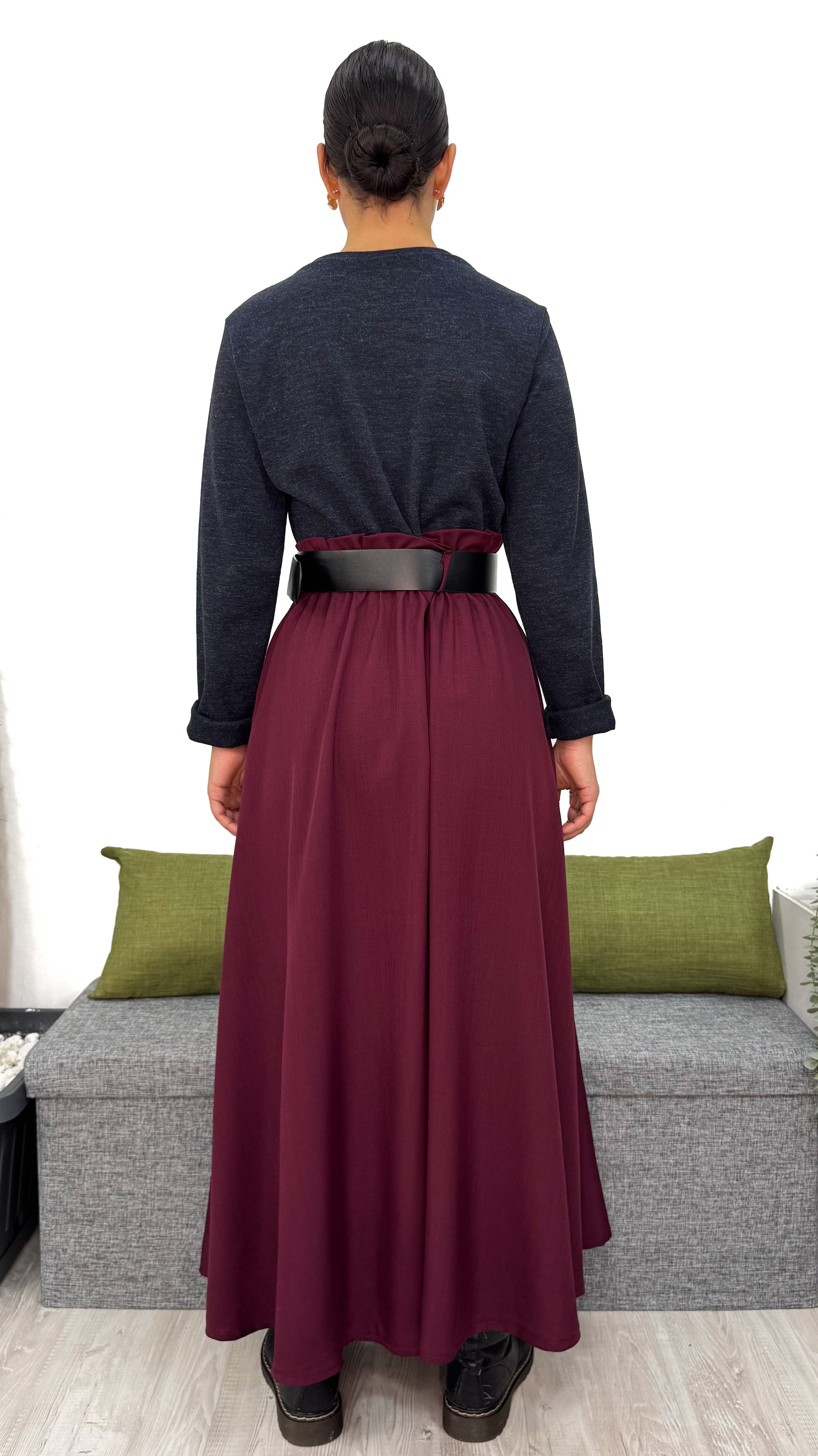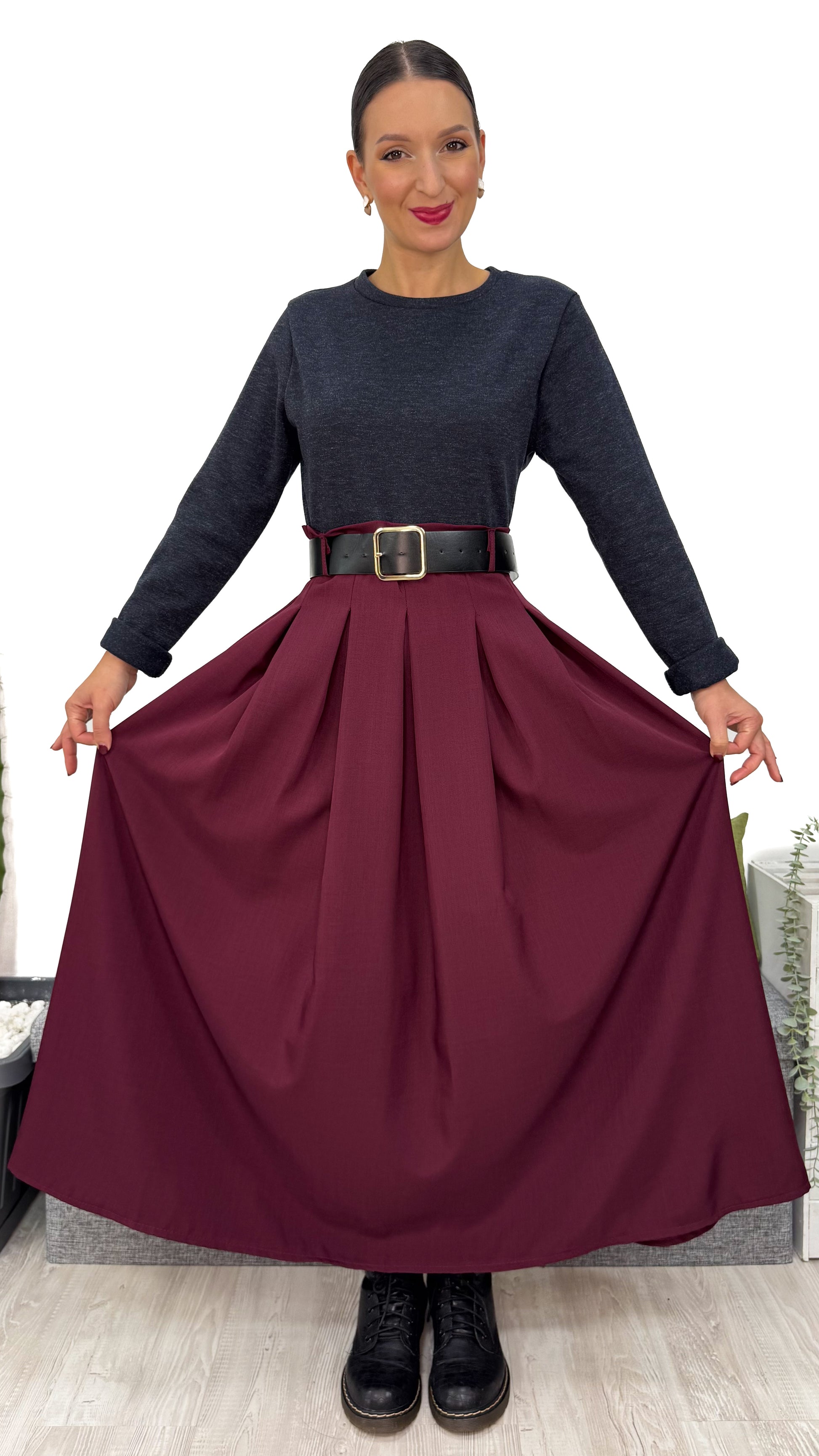- La parte inferiore è una gonna lunga in tessuto sartoriale, con effetto pieghe, vita a caramella con elastico e passanti, e cintura coordinata inclusa.