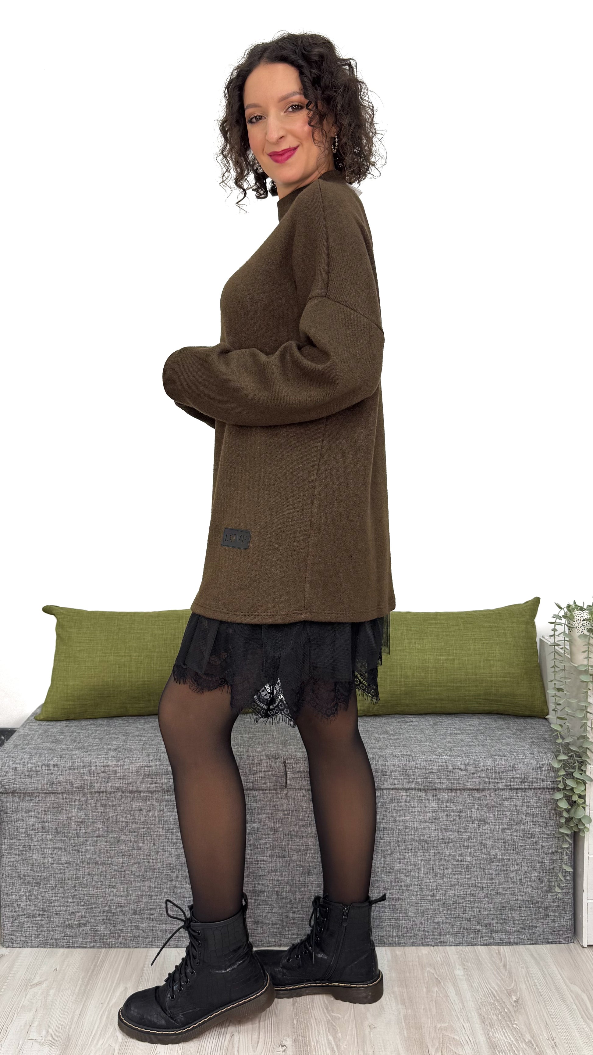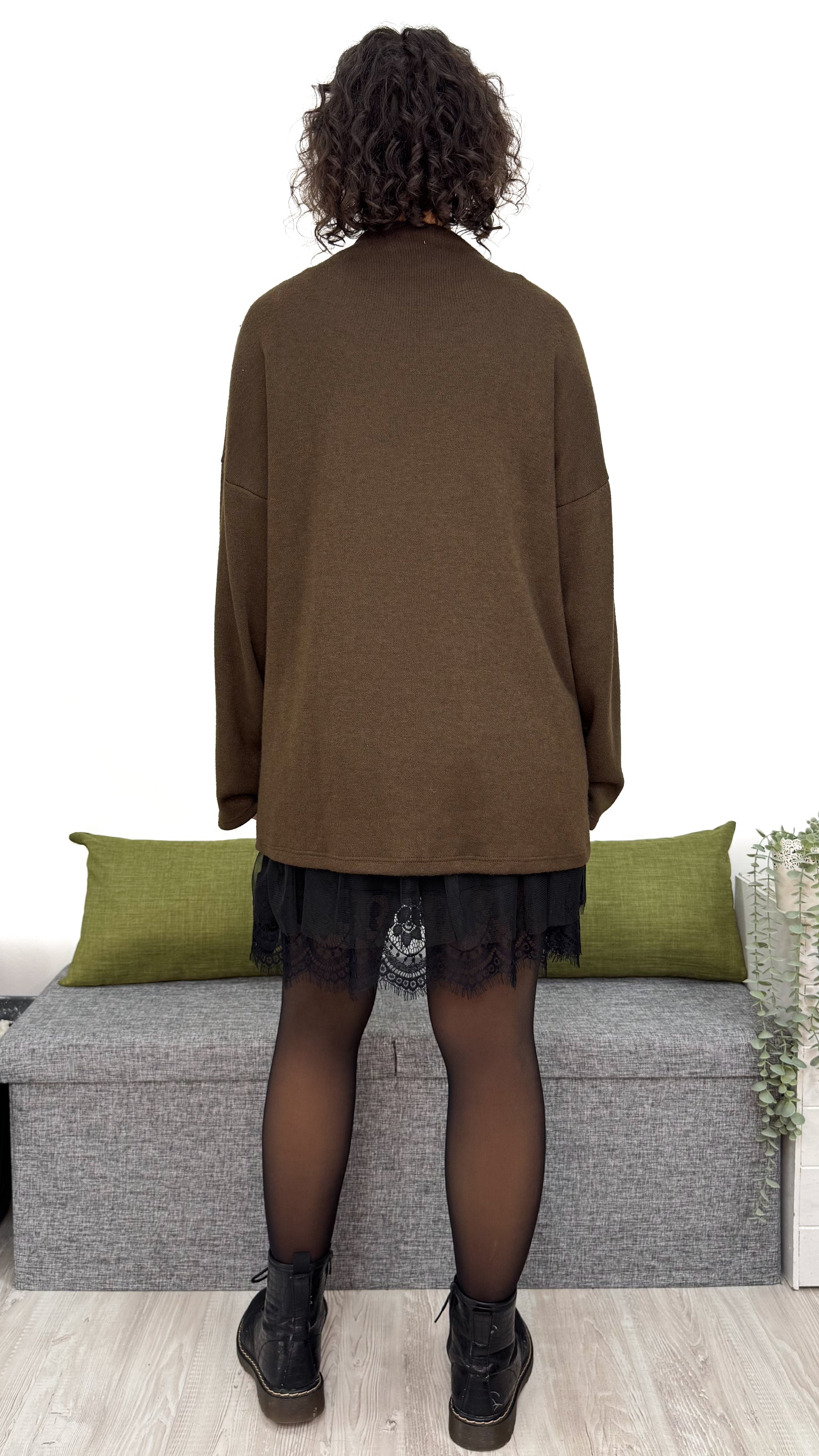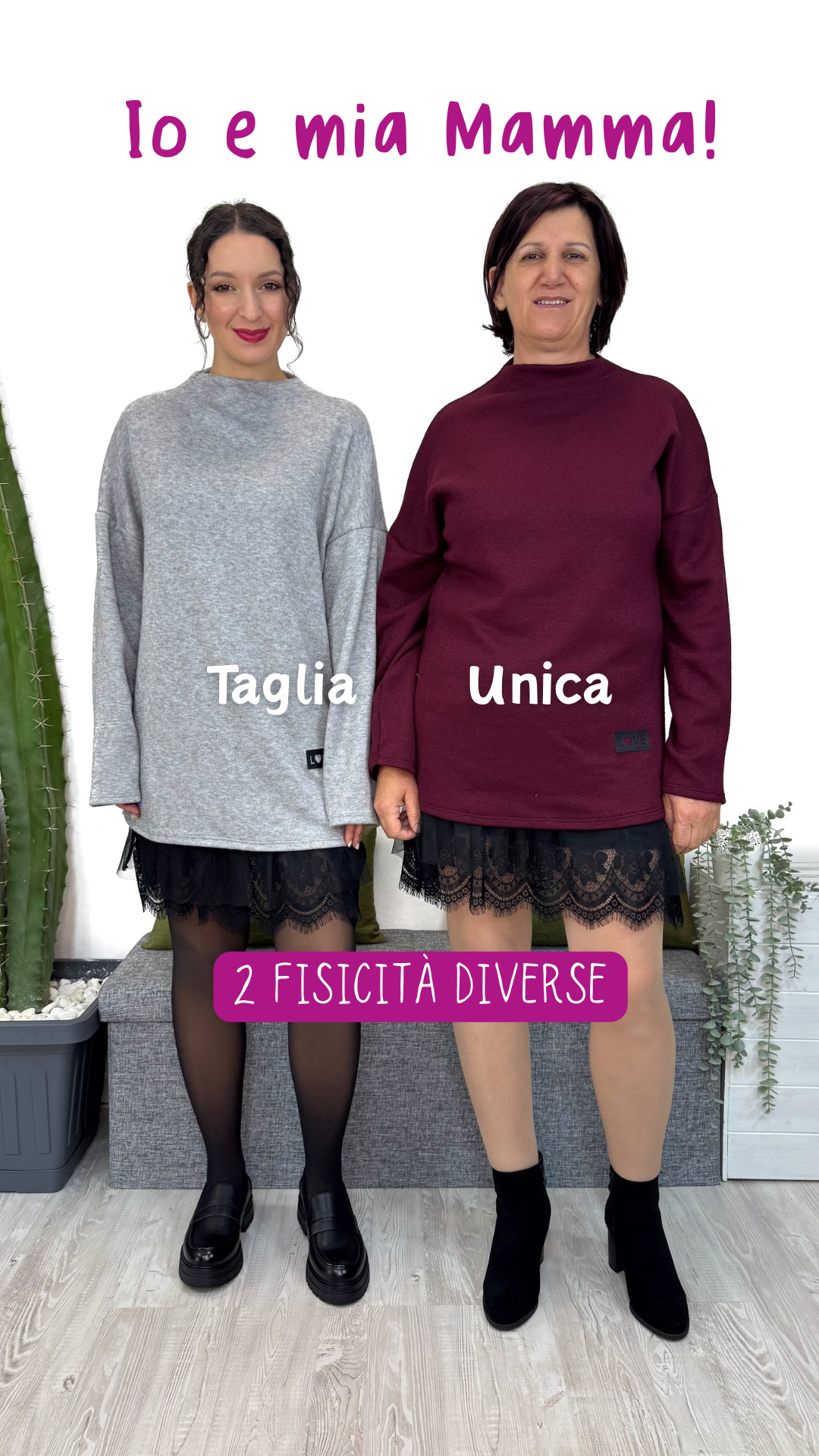 - Lunghezza del maglione a metà coscia che dona equilibrio e armonia a tutta la figura