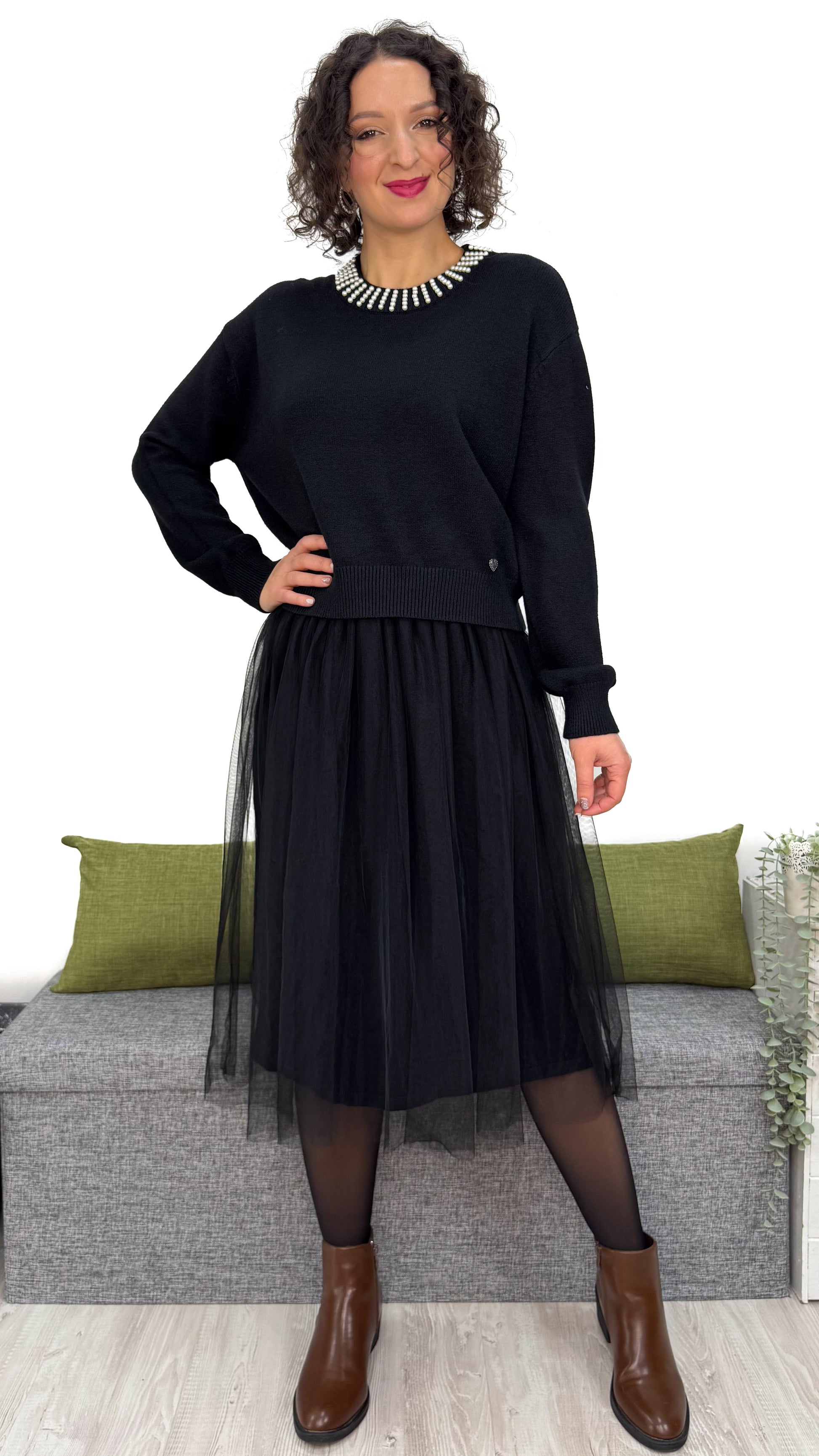 ABITO MAGLIA E TULLE — Un abito che sembra un tutt’uno ma è molto di più ! Due pezzi studiati per valorizzarti: abito in maglia con canotta e gonna morbida tulle leggero che aggiunge magia e un maglioncino abbinato con colletto di perle che puoi usare anche con qualsiasi pantalone jeans o altra gonna.