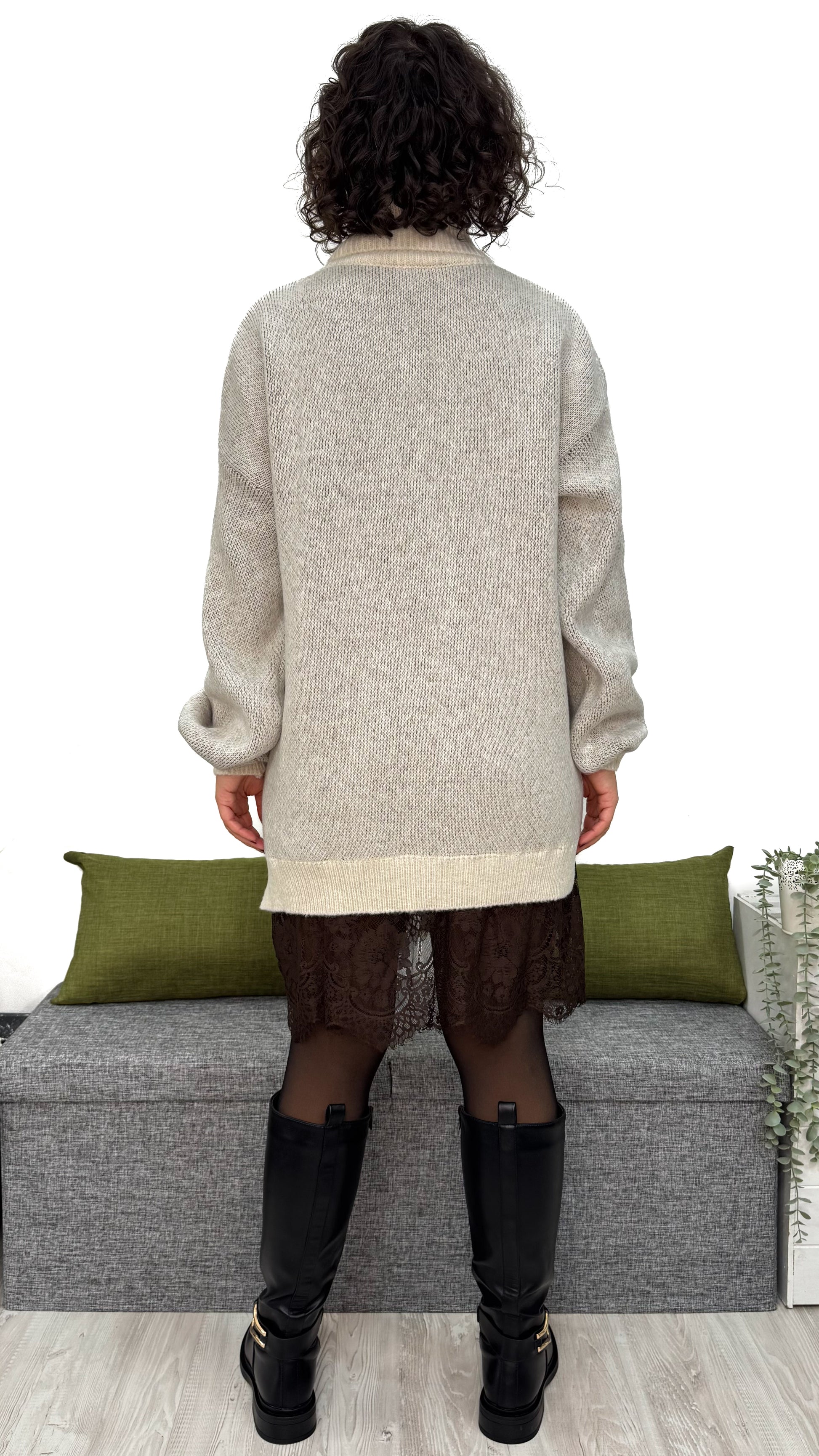 Questo ABITO/MAGLIONE è perfetto per l’autunno/inverno: soffice, caldo e con quel tocco romantico del pizzo che fa la differenza.