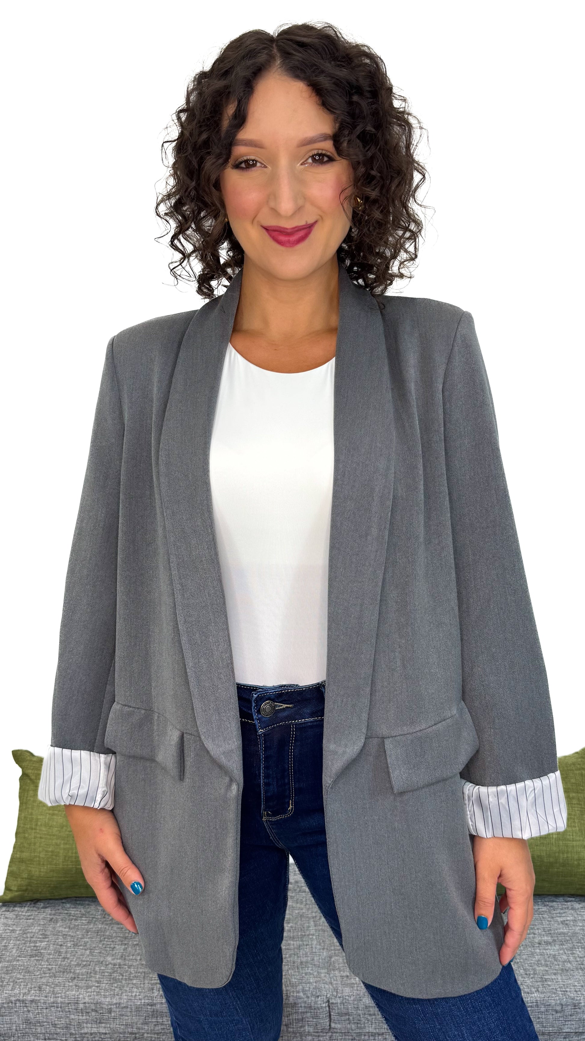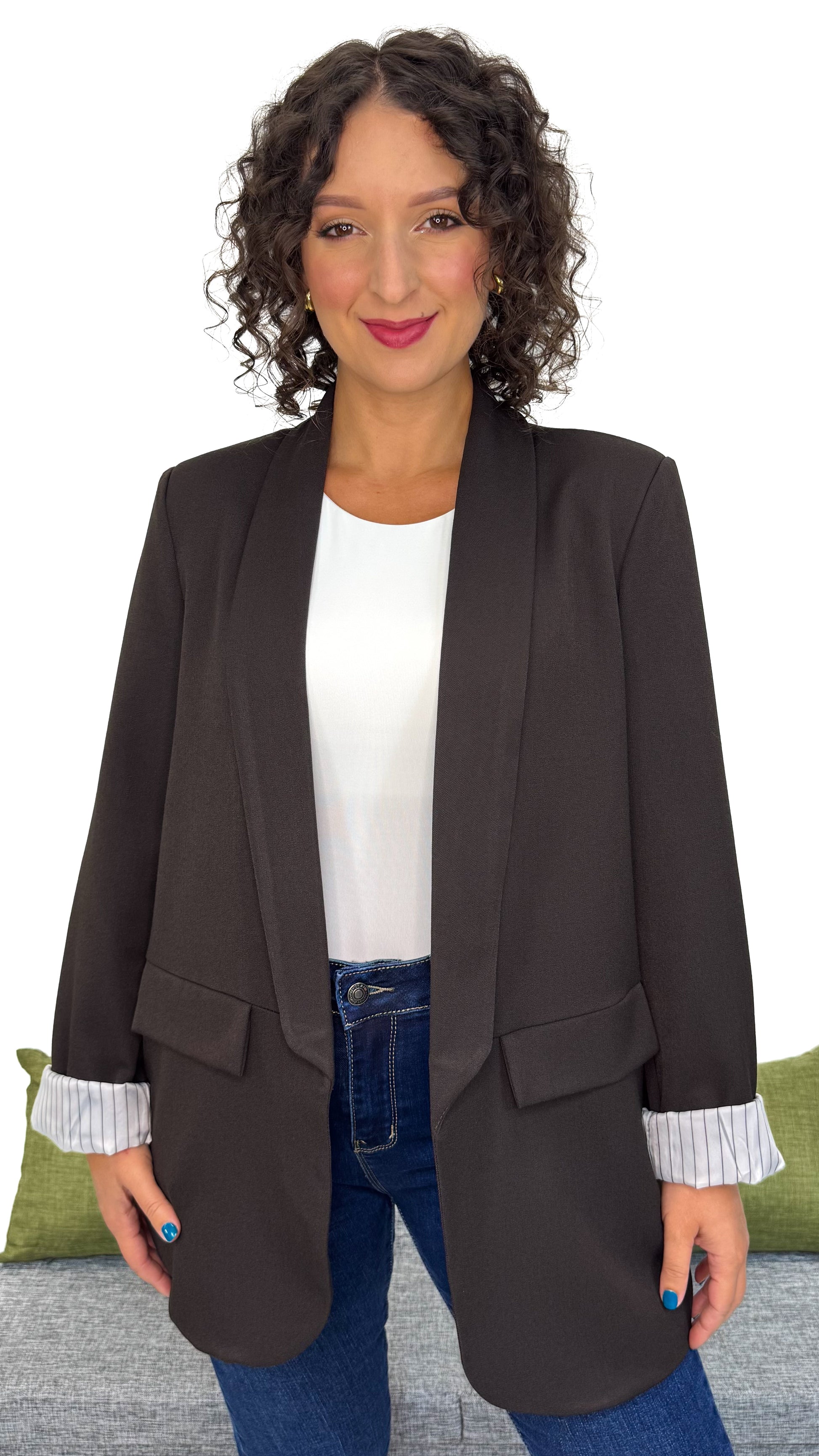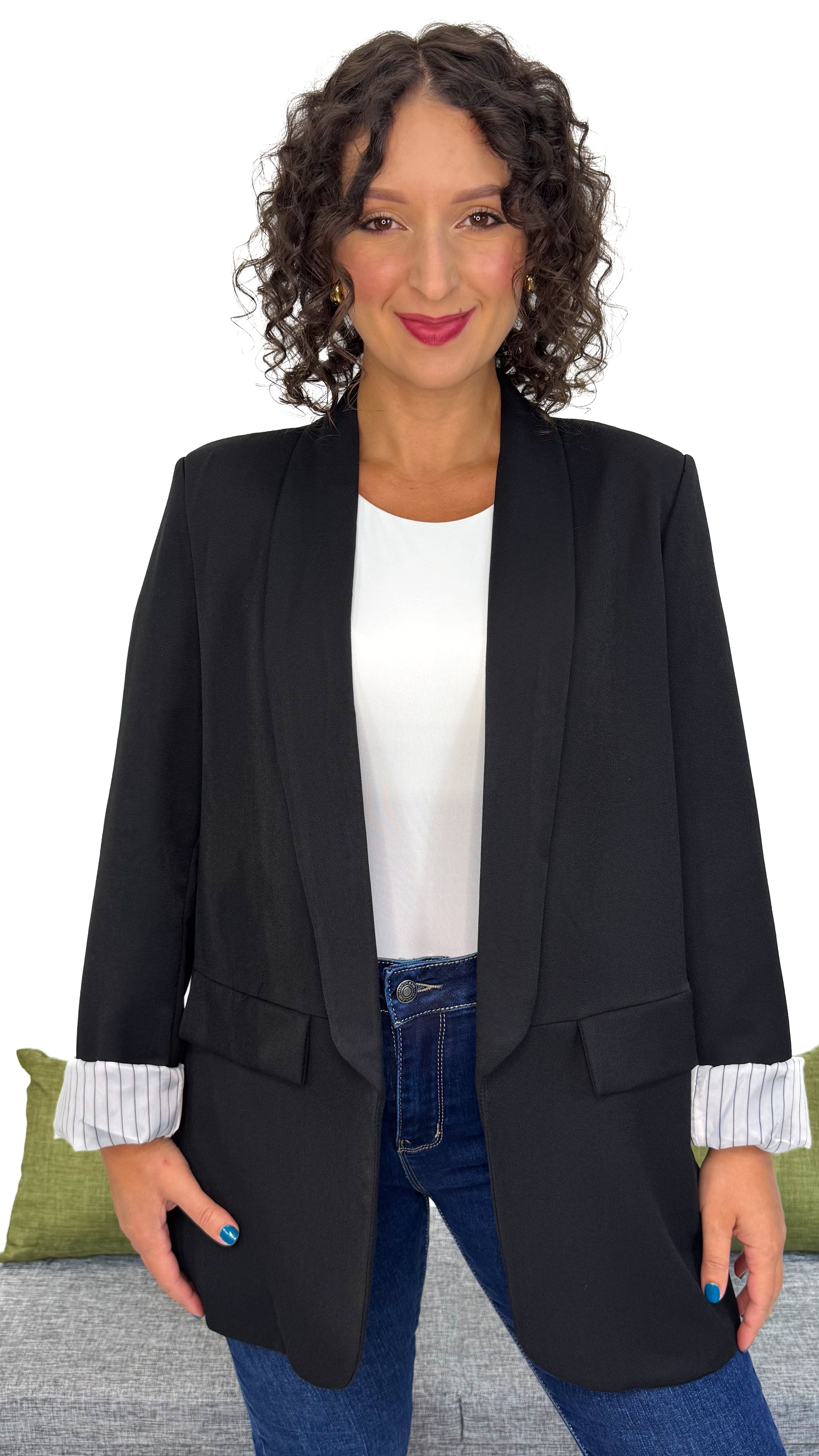 - Maniche lunghe risvoltate → l’interno gessato bianco crea un contrasto raffinato e moderno