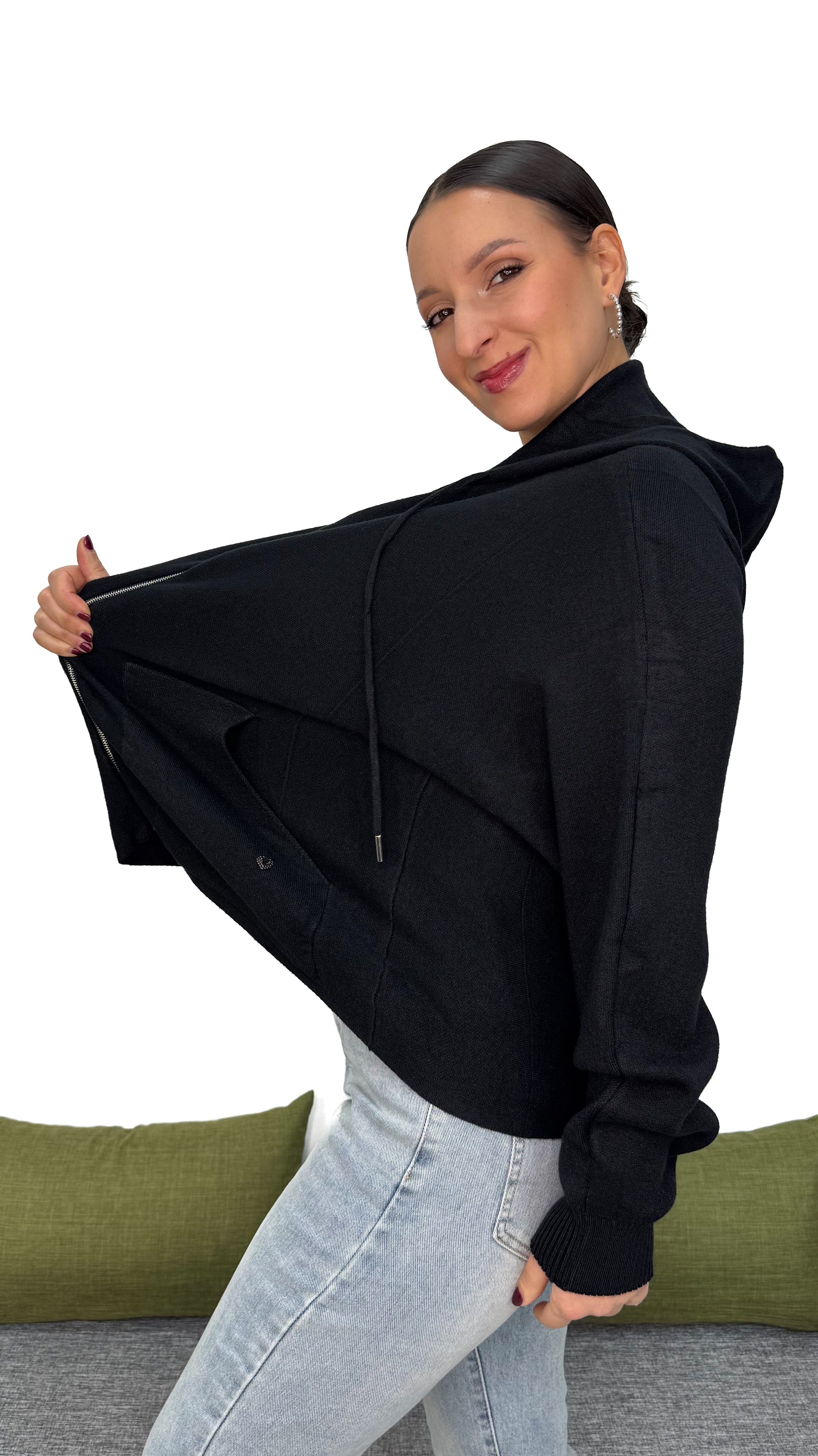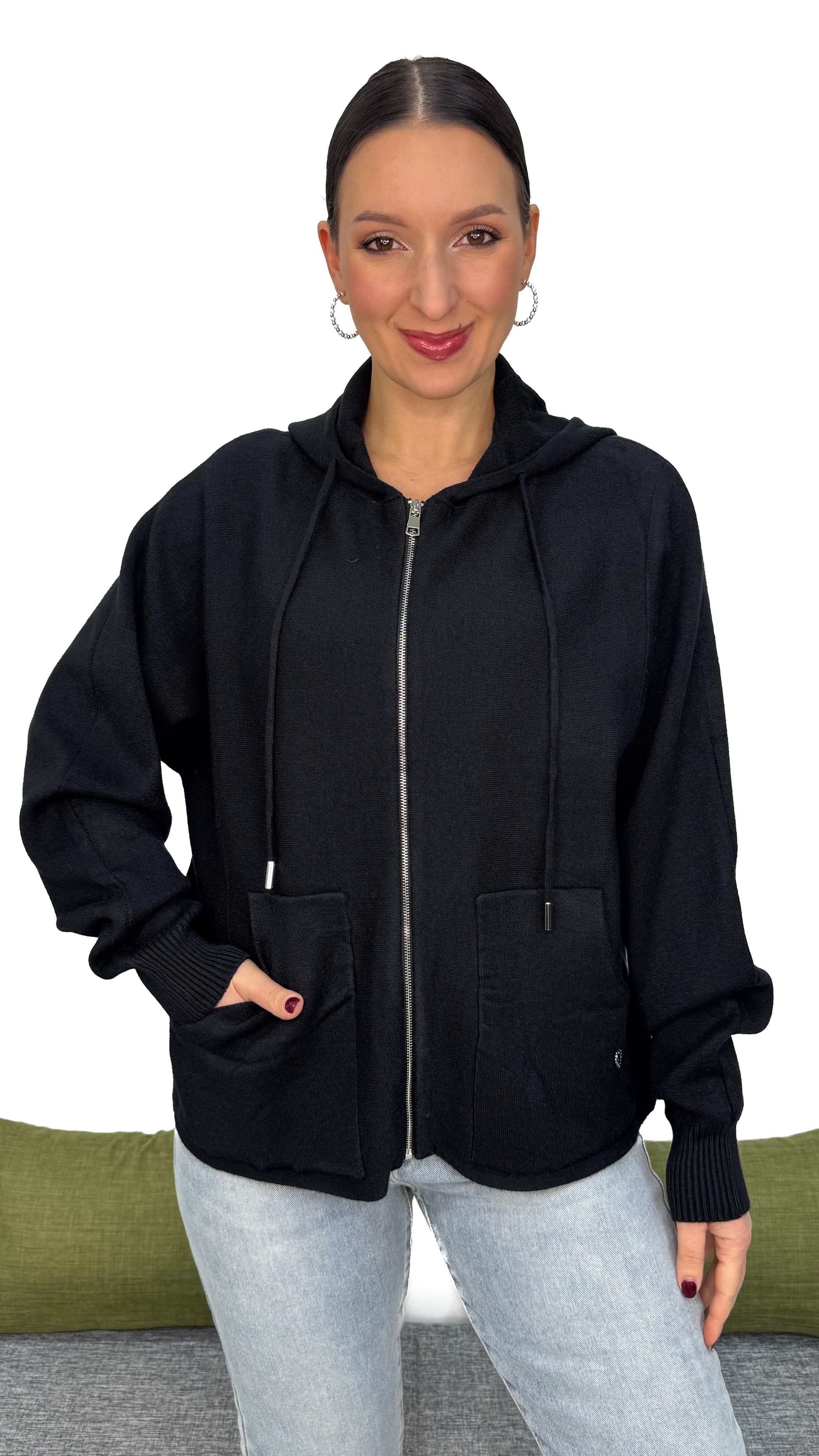 - Zip frontale: indossalo chiuso come abito o aperto come cardigan, sempre con stile.