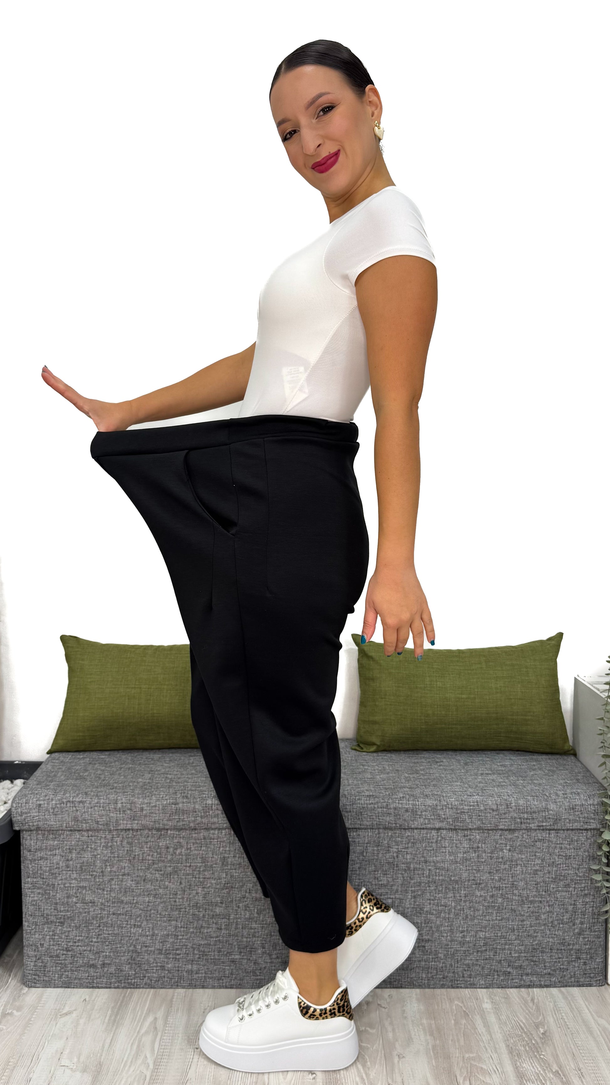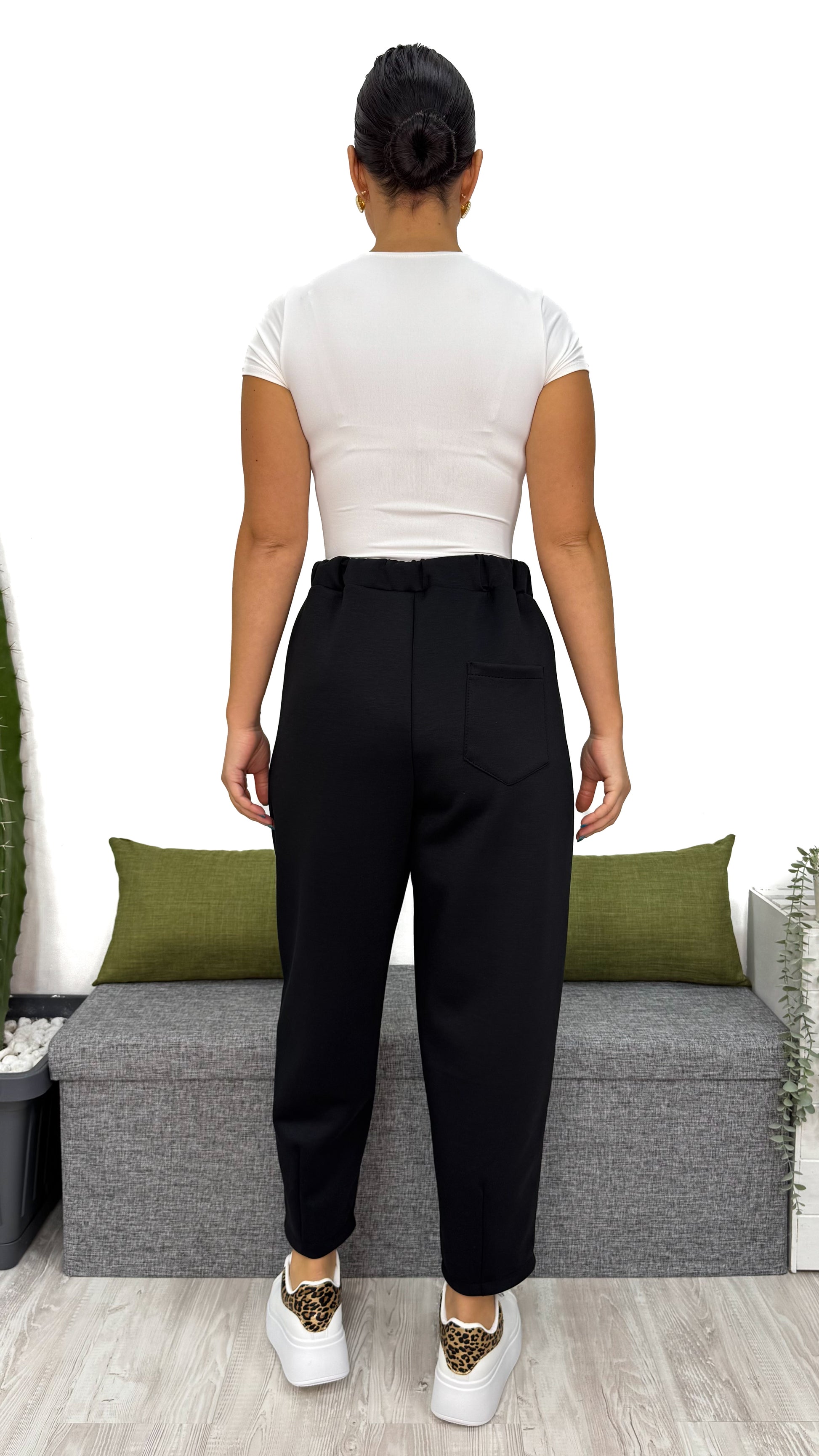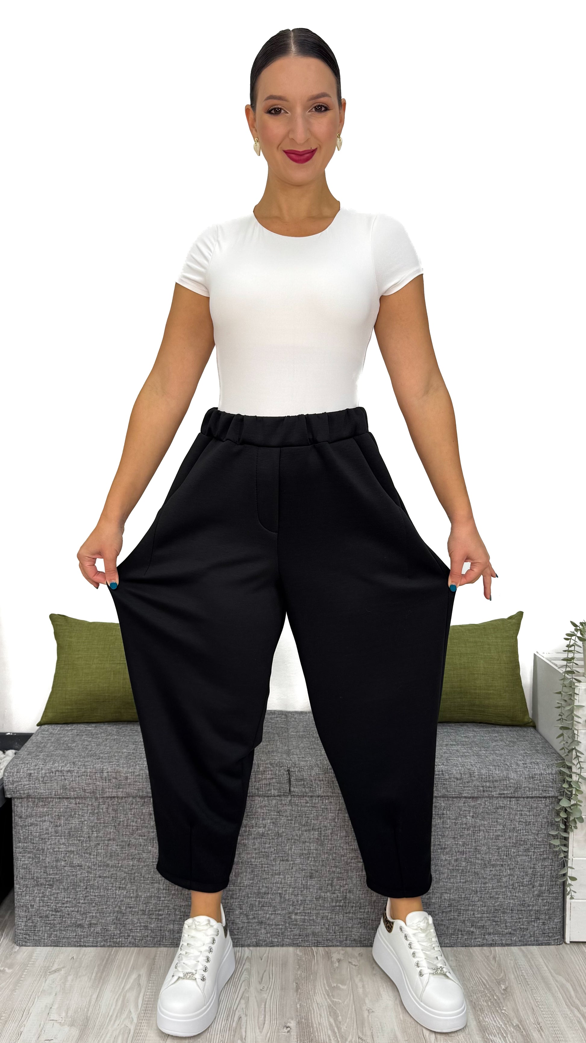 - Pantalone Ballon: ampio, leggero, con due tasche strategiche e un elastico in vita che ti segue senza stringere.