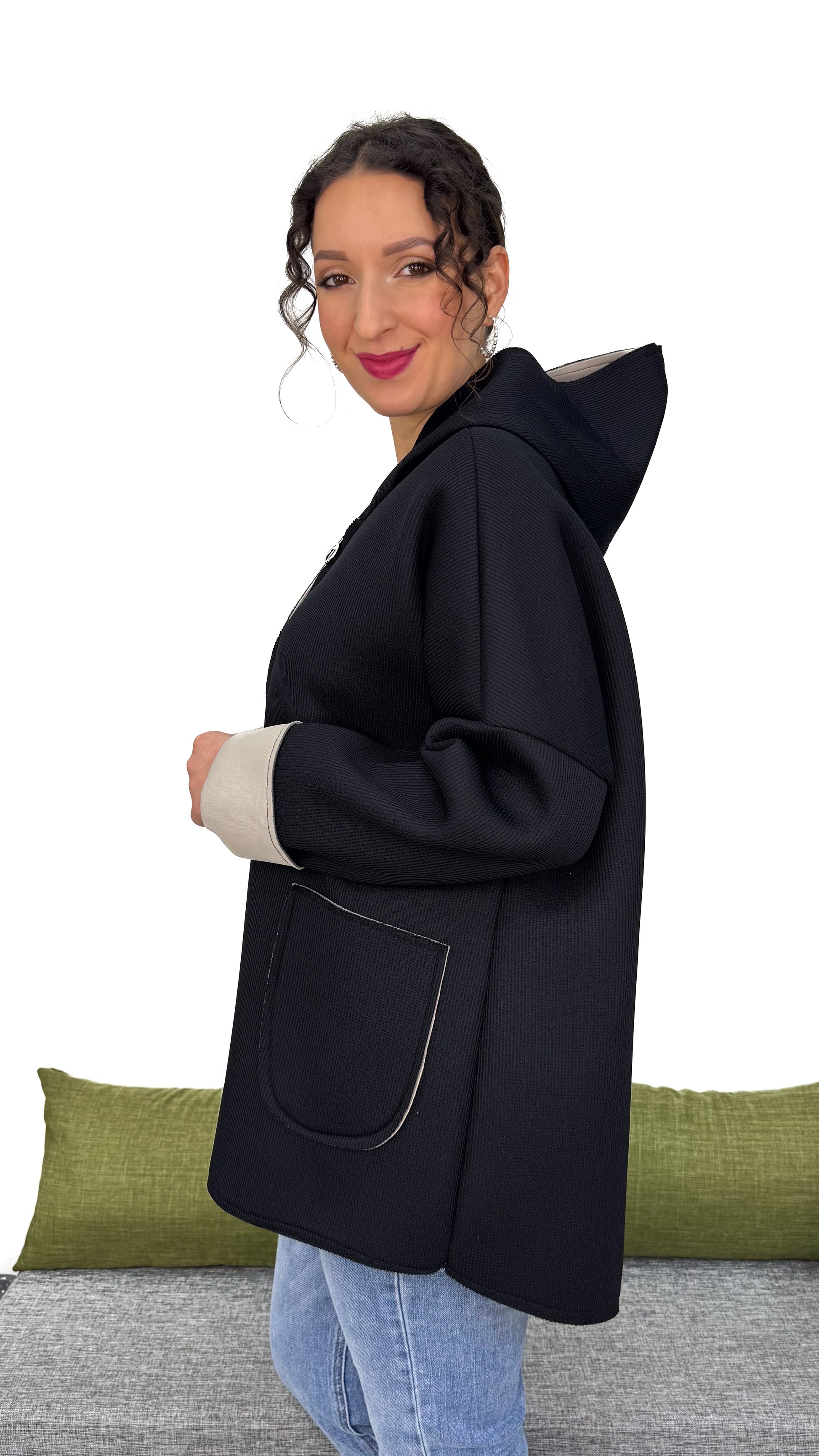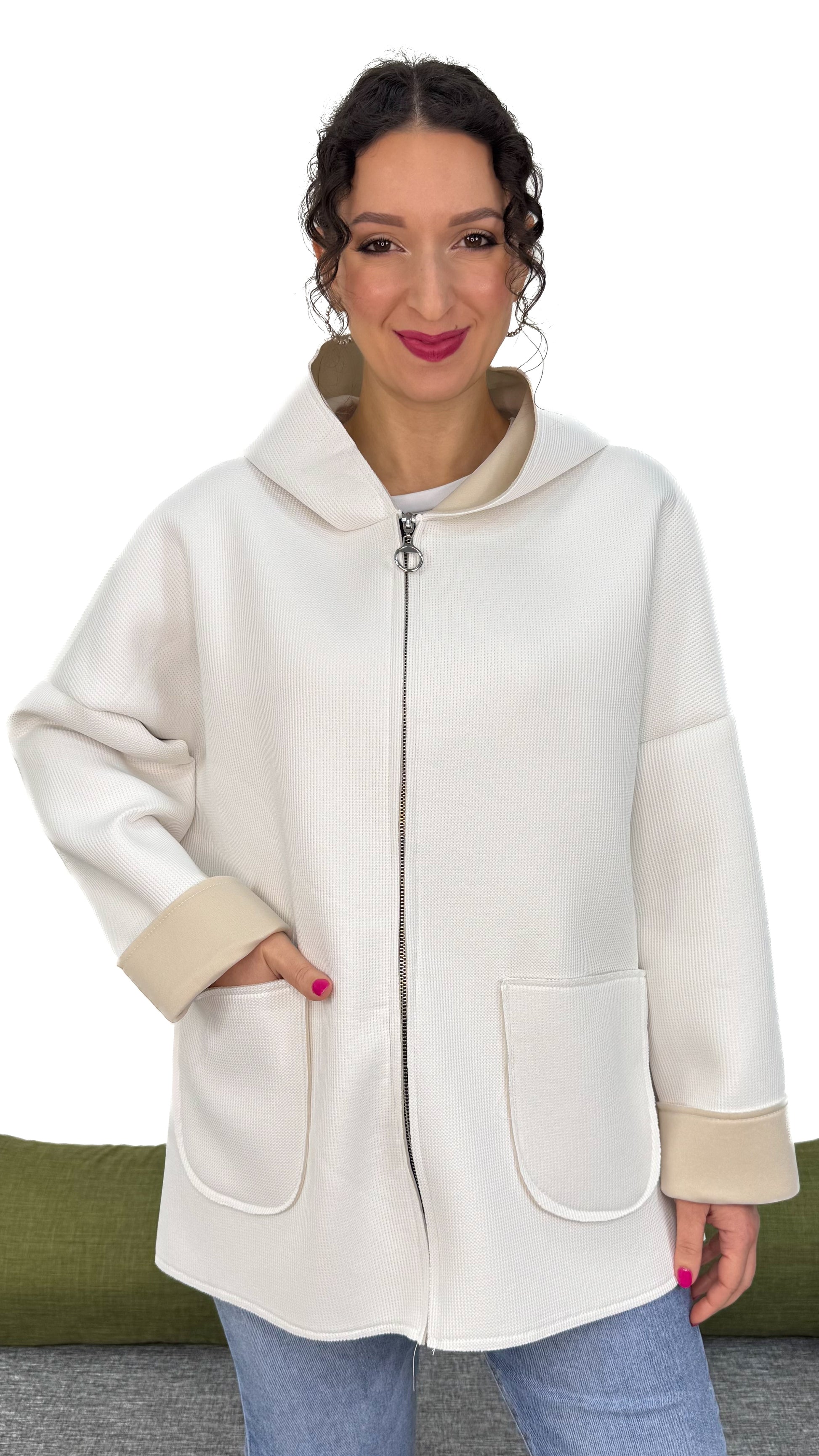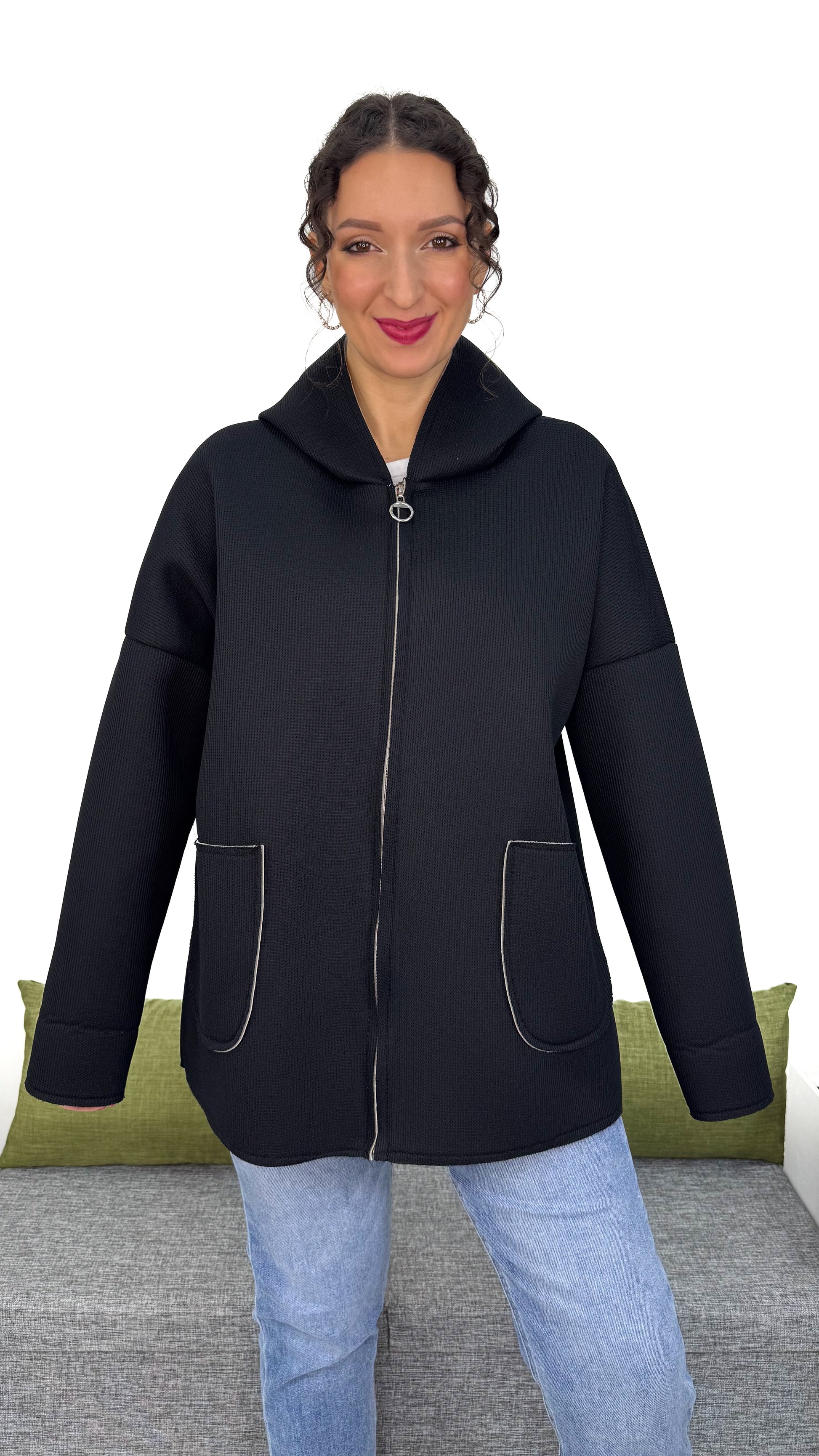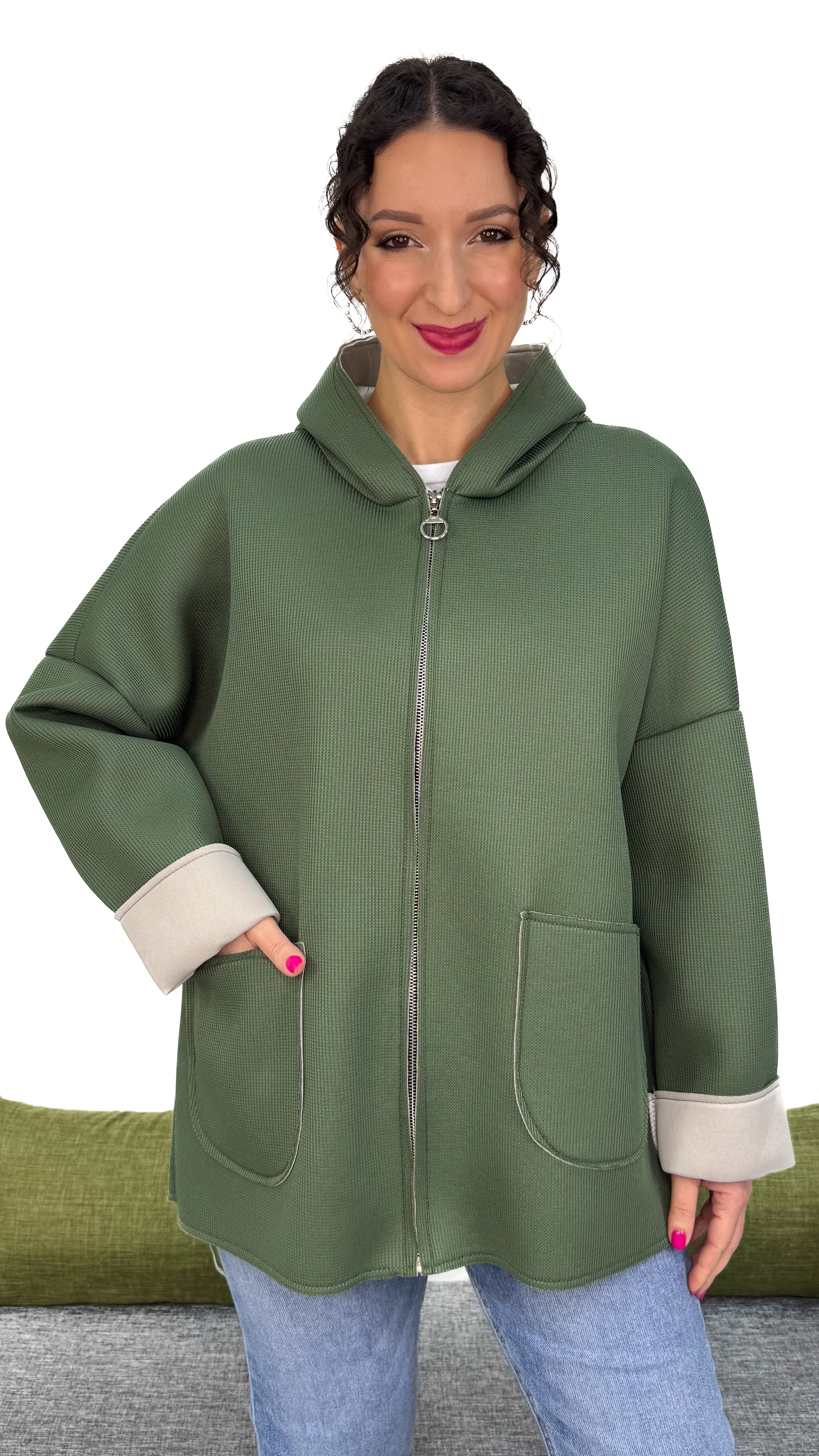 Ha il cappuccio per un tocco casual chic, due taschini frontali super pratici e la chiusura con zip, così puoi indossarla sia aperta che chiusa a seconda del look.