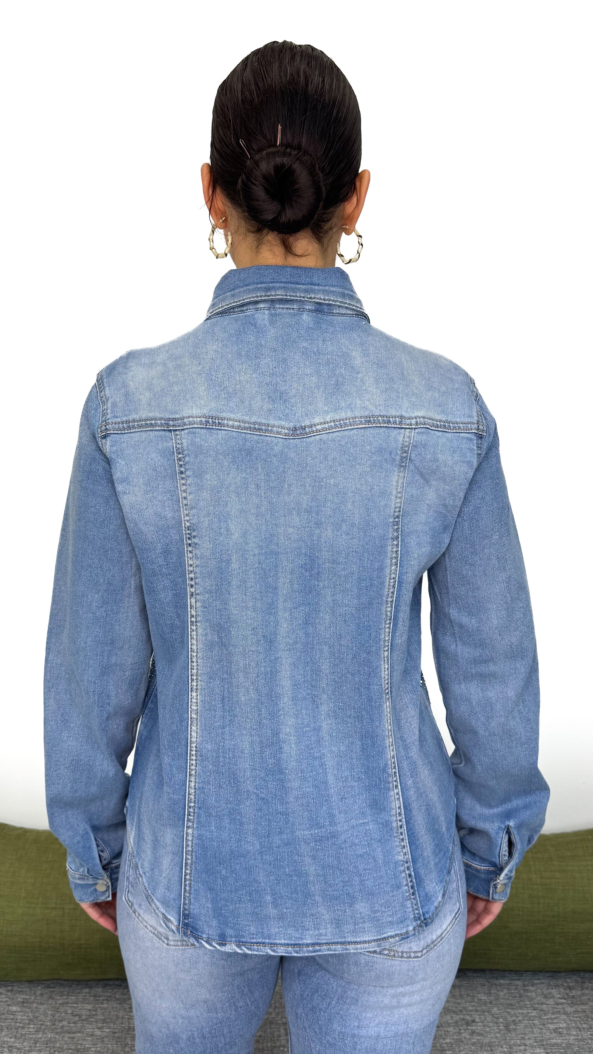 Sul davanti è impreziosita da strass delicati, che donano luminosità e femminilità senza esagerare. Un dettaglio chic che trasforma una semplice giacca in un capo speciale.