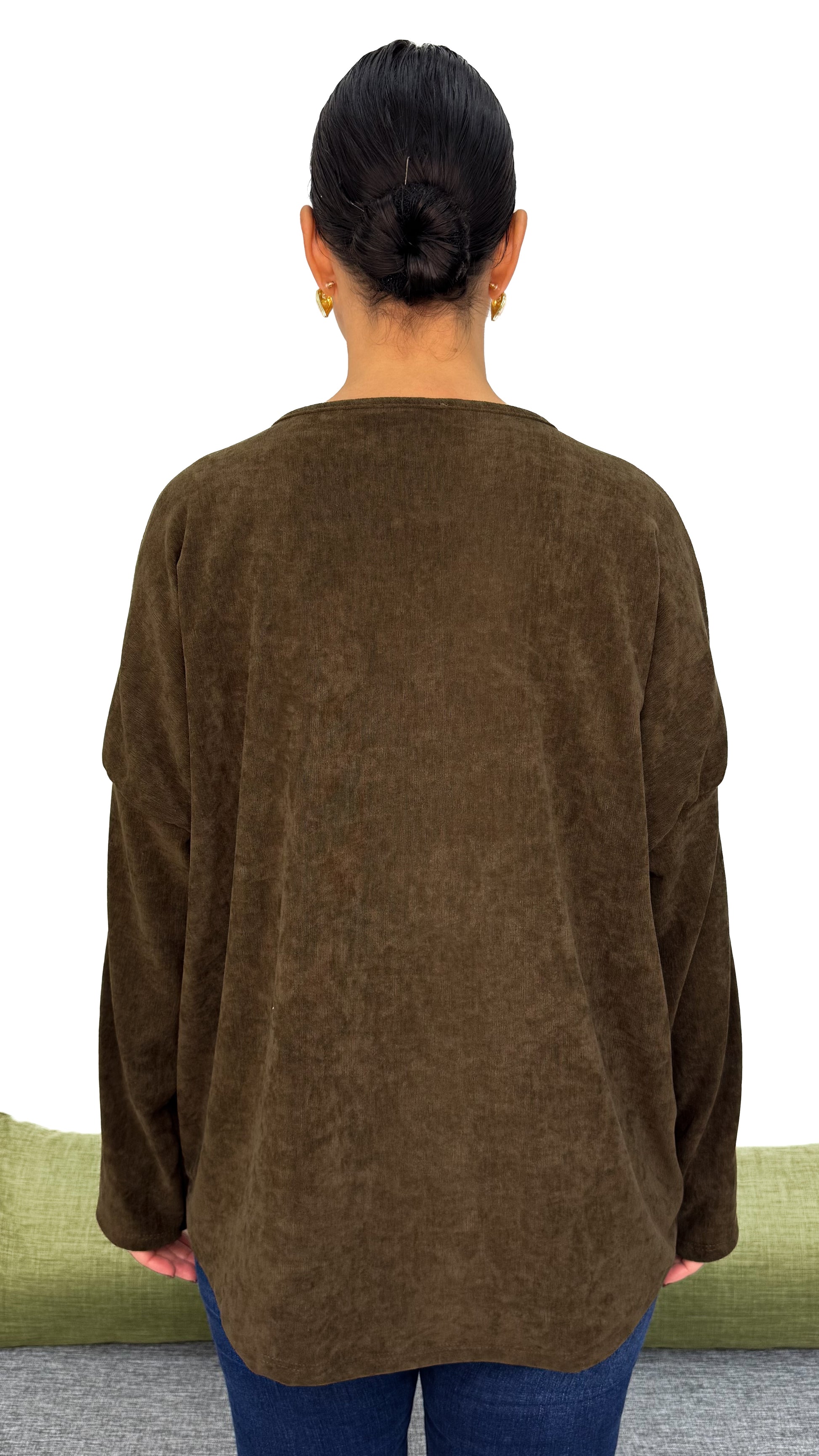 Una maglia raffinata e avvolgente, perfetta per aggiungere un tocco di eleganza ai tuoi look quotidiani. La sua linea morbida e fluida valorizza ogni silhouette, mentre il tessuto in velluto liscio regala una sensazione di calore e morbidezza assoluta, come una coccola sulla pelle.