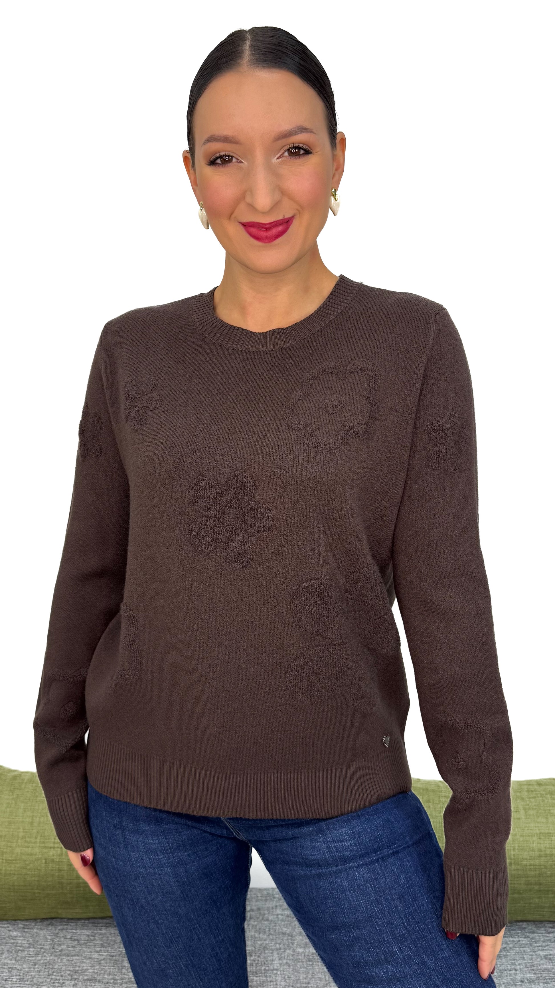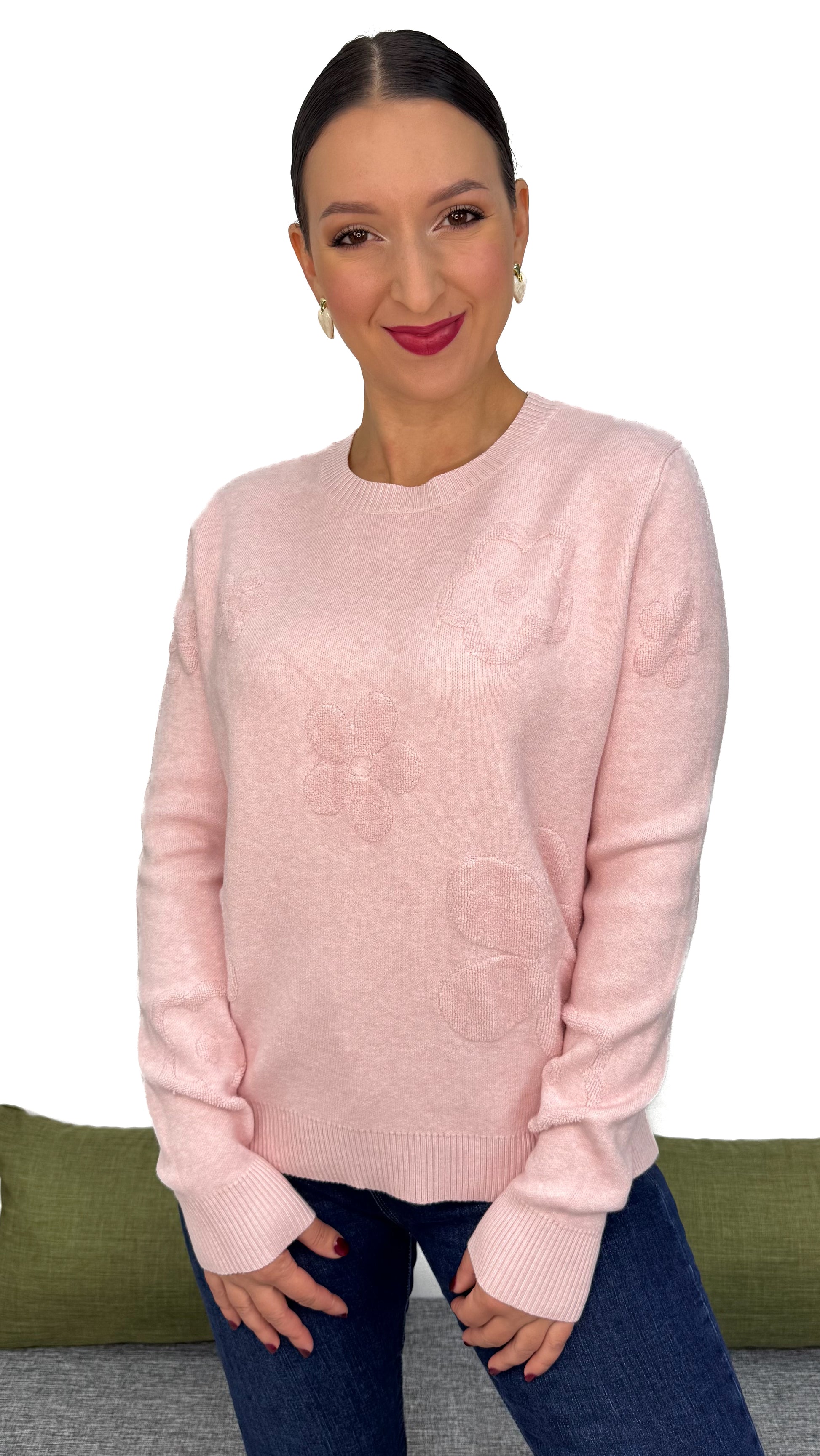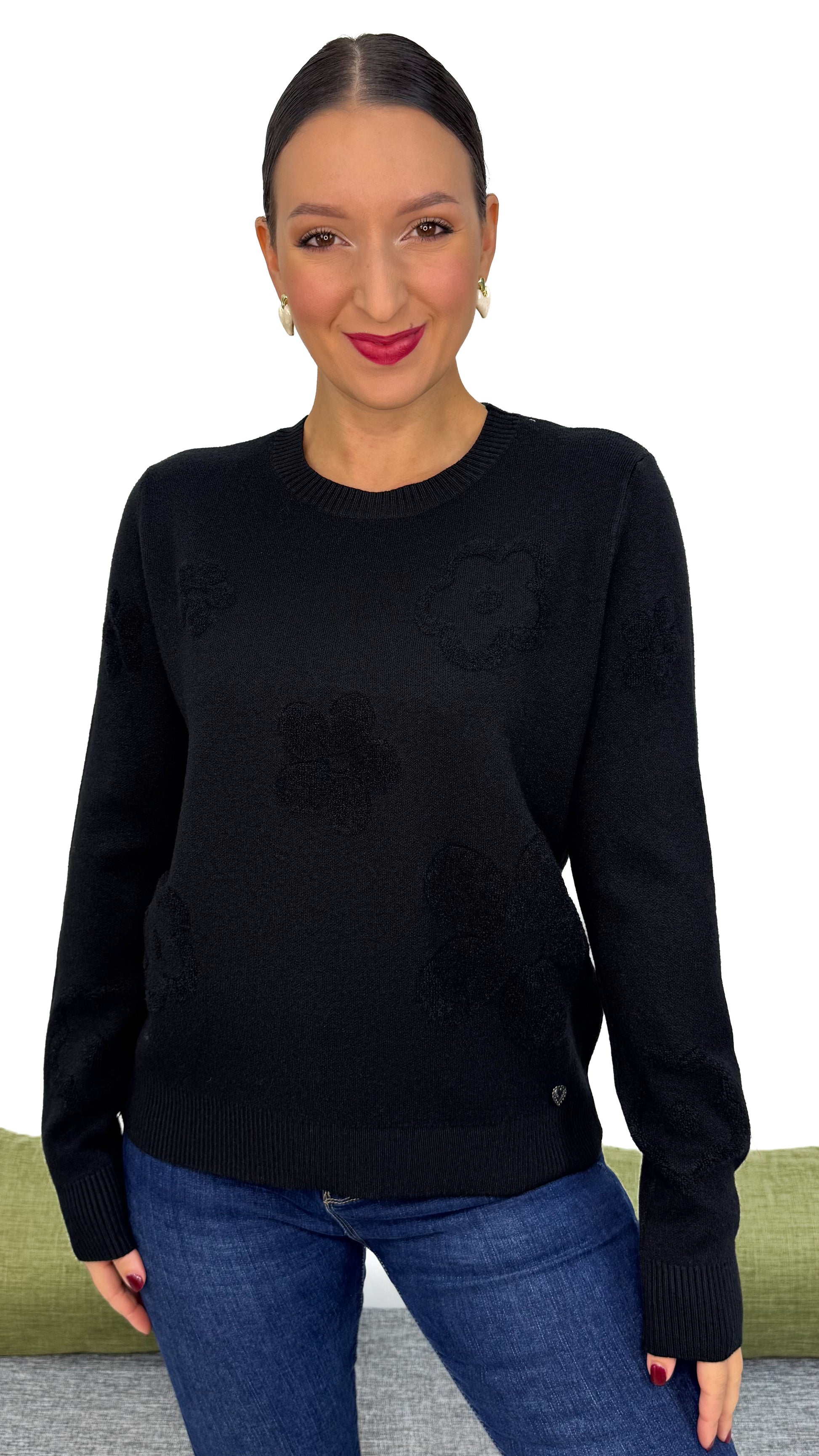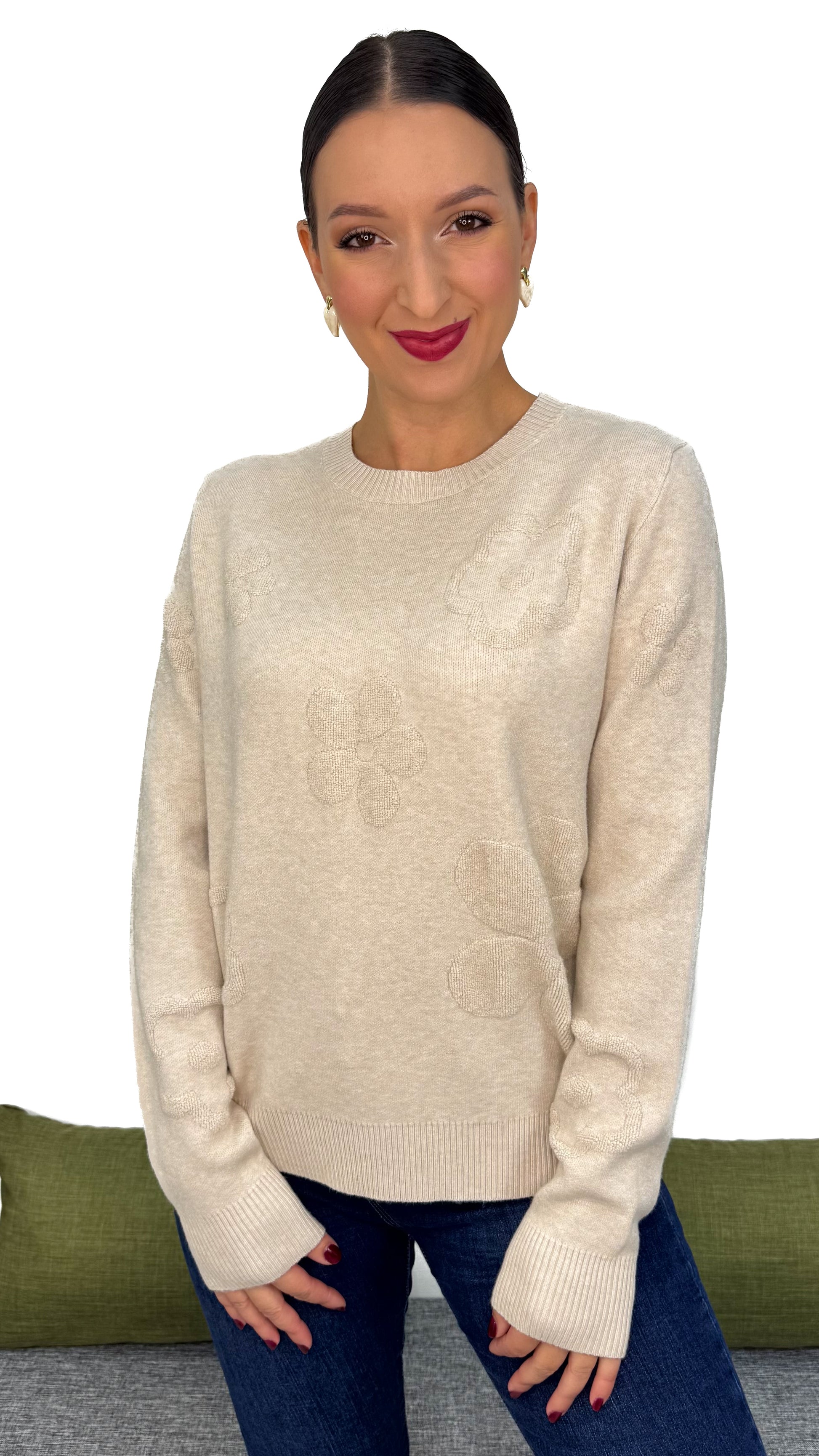 Un maglioncino che sembra uscito da un sogno, curato in ogni dettaglio per farti sentire bella e raffinata in ogni occasione. I fiori in rilievo di varie dimensioni lo rendono unico e femminile, un piccolo capolavoro di stile che impreziosisce anche il look più semplice.