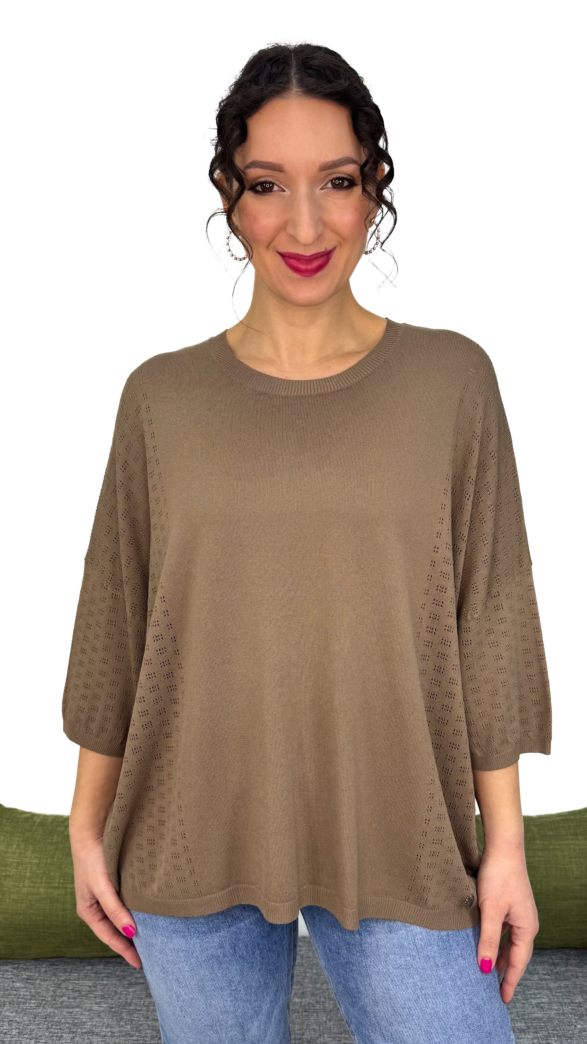 La linea è pulita e basic, ma lungo la parte laterale e sulle maniche trovi una trama bucherellata delicata, che dona leggerezza, movimento e un effetto super femminile.