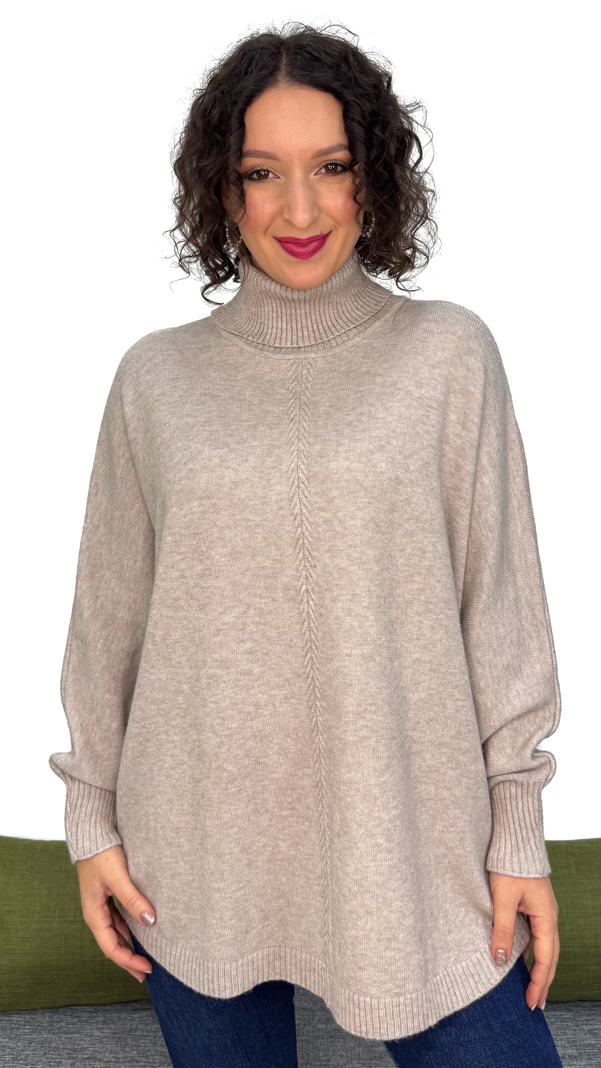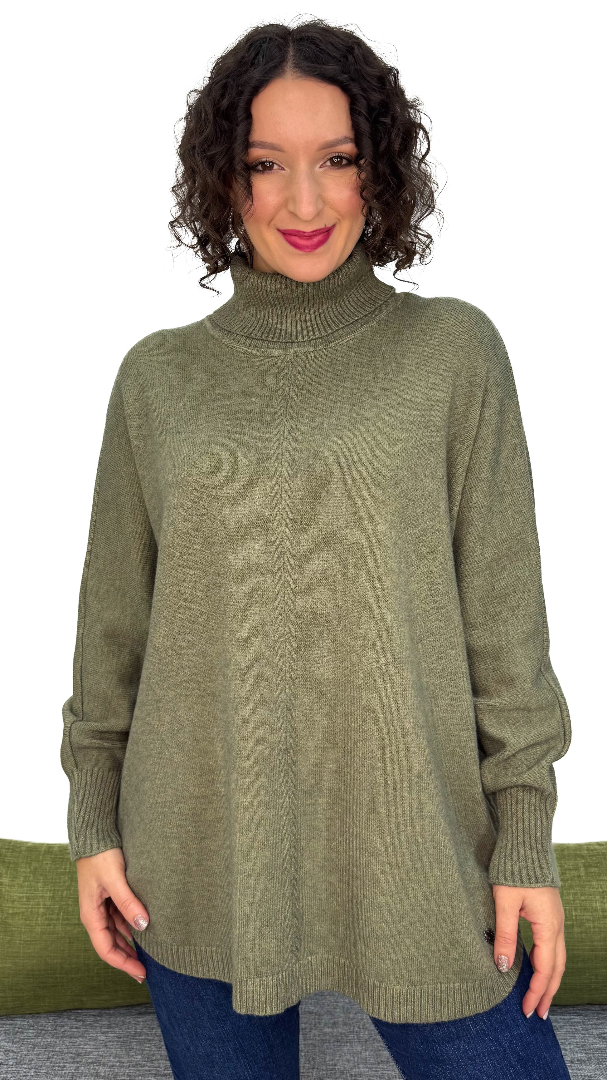 MAGLIONE MORBIDEZZA — un dolcevita morbido e soffice che cade alla perfezione, la lunghezza media valorizza tutte le fisicità i due spacchetti laterali con bottoni aggiungono un dettaglio ricercato e la piccola trama centrale snellisce e verticalizza subito la figura!