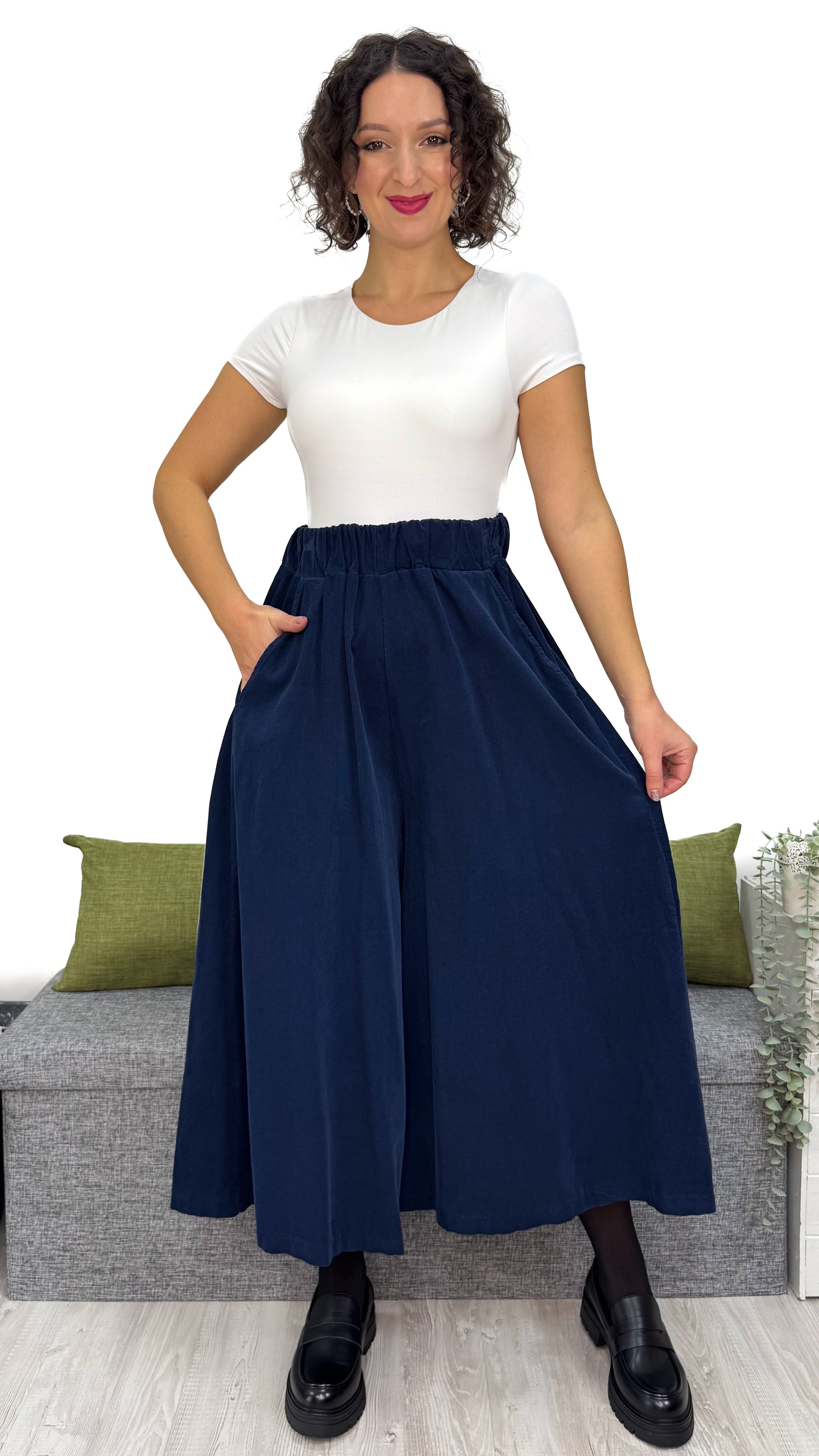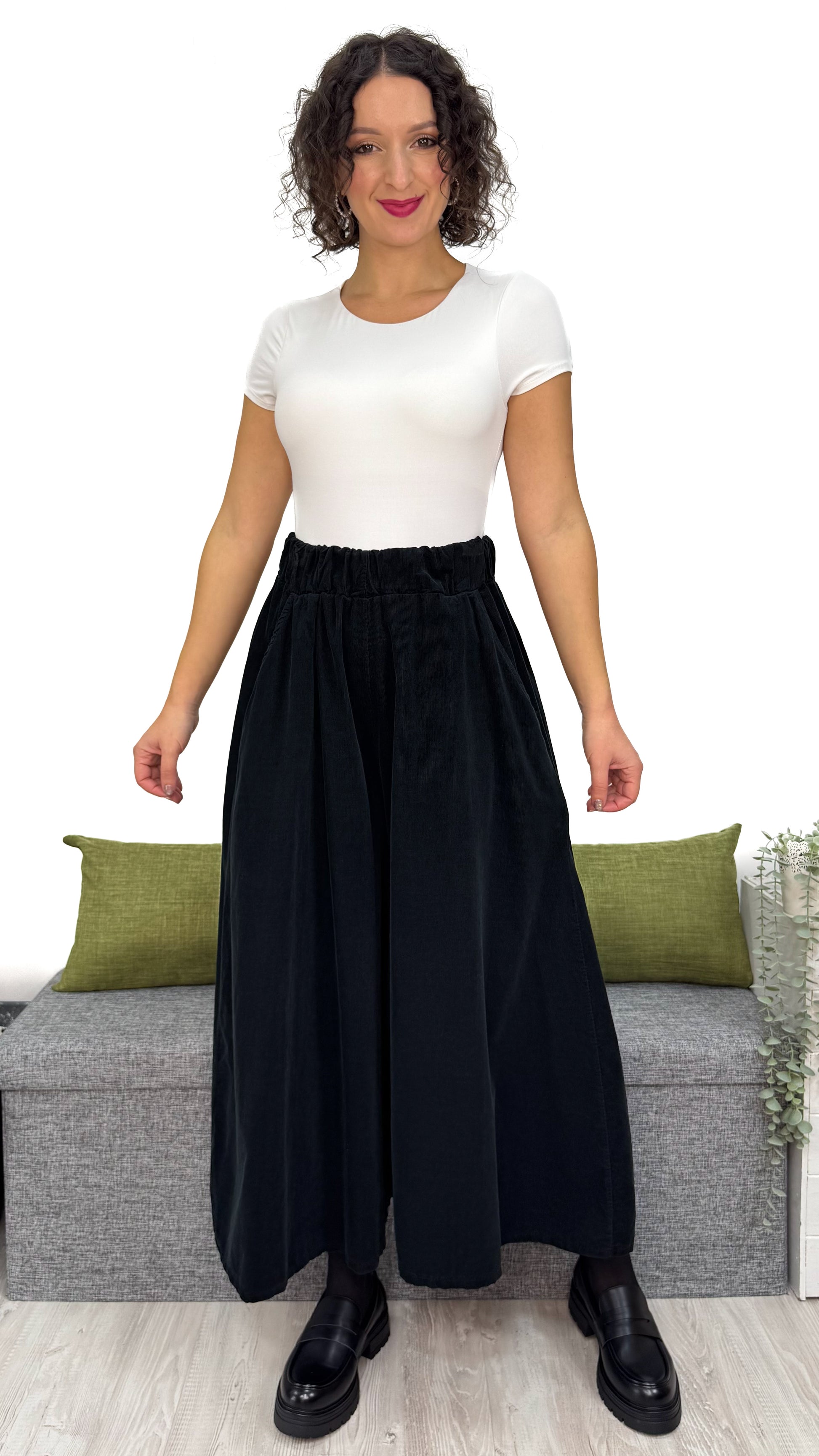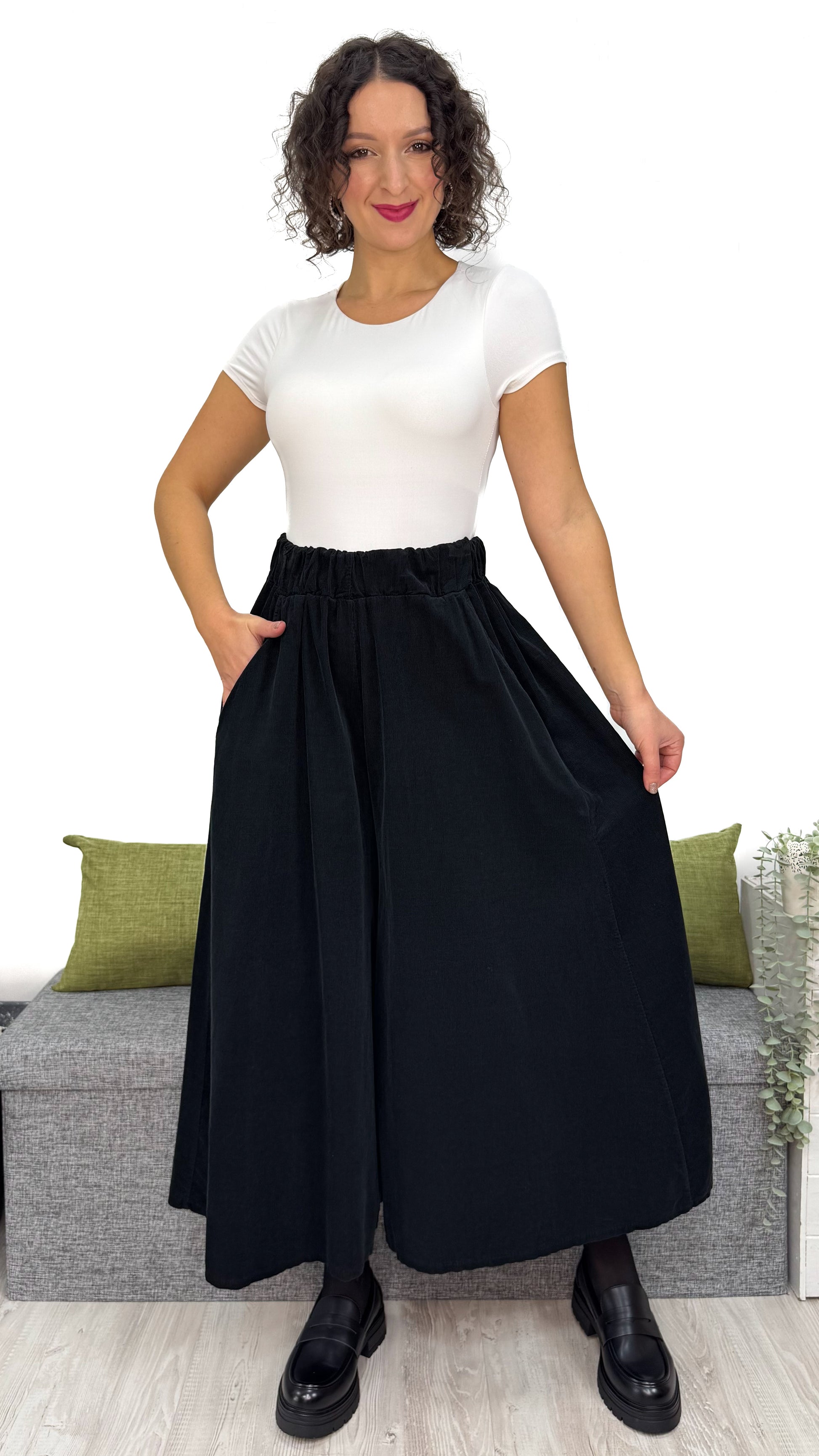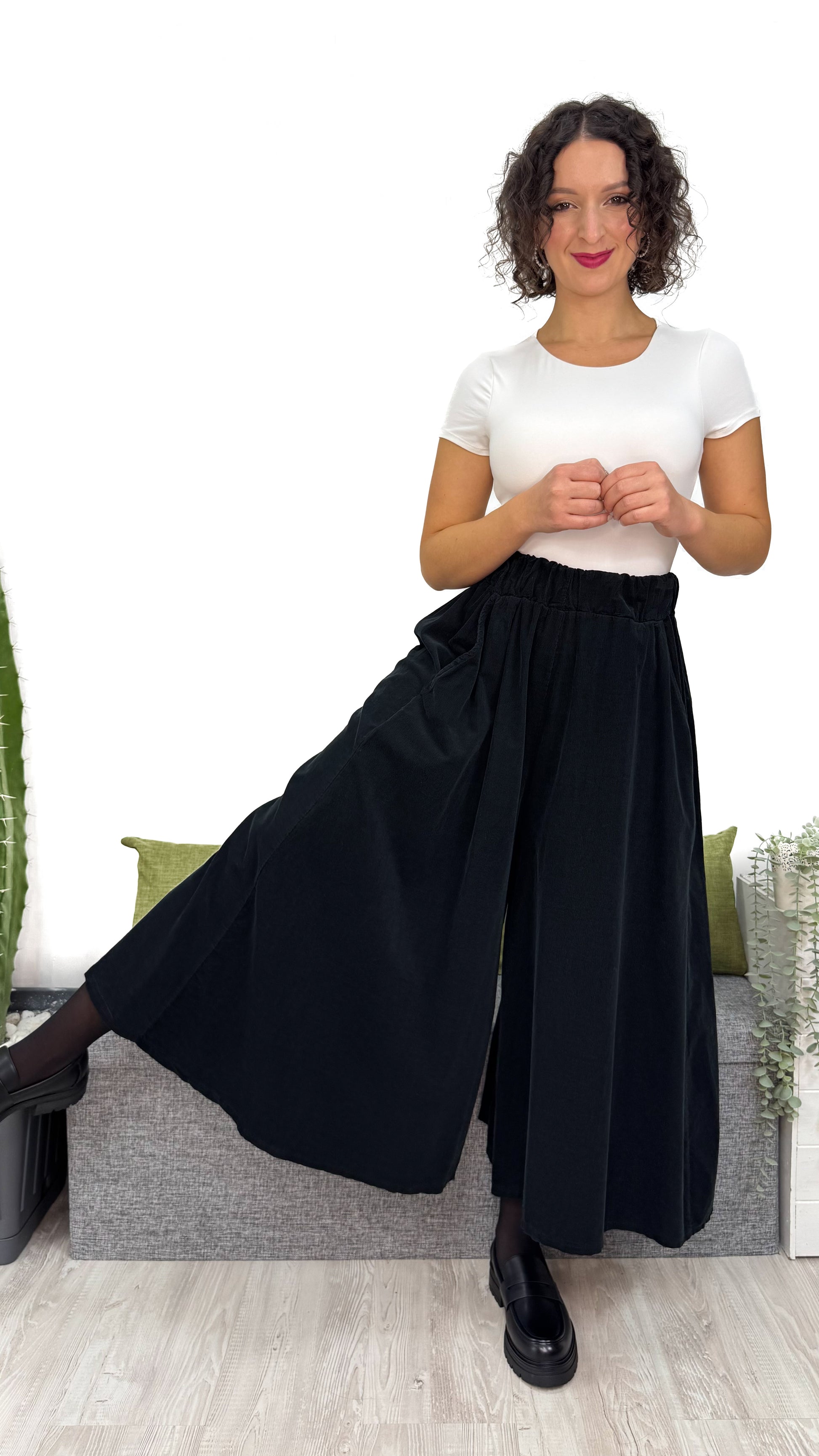 - Taglio ampio con effetto gonna — scende fluido e leggero, si apre ad ogni passo e sfiora la caviglia con eleganza.