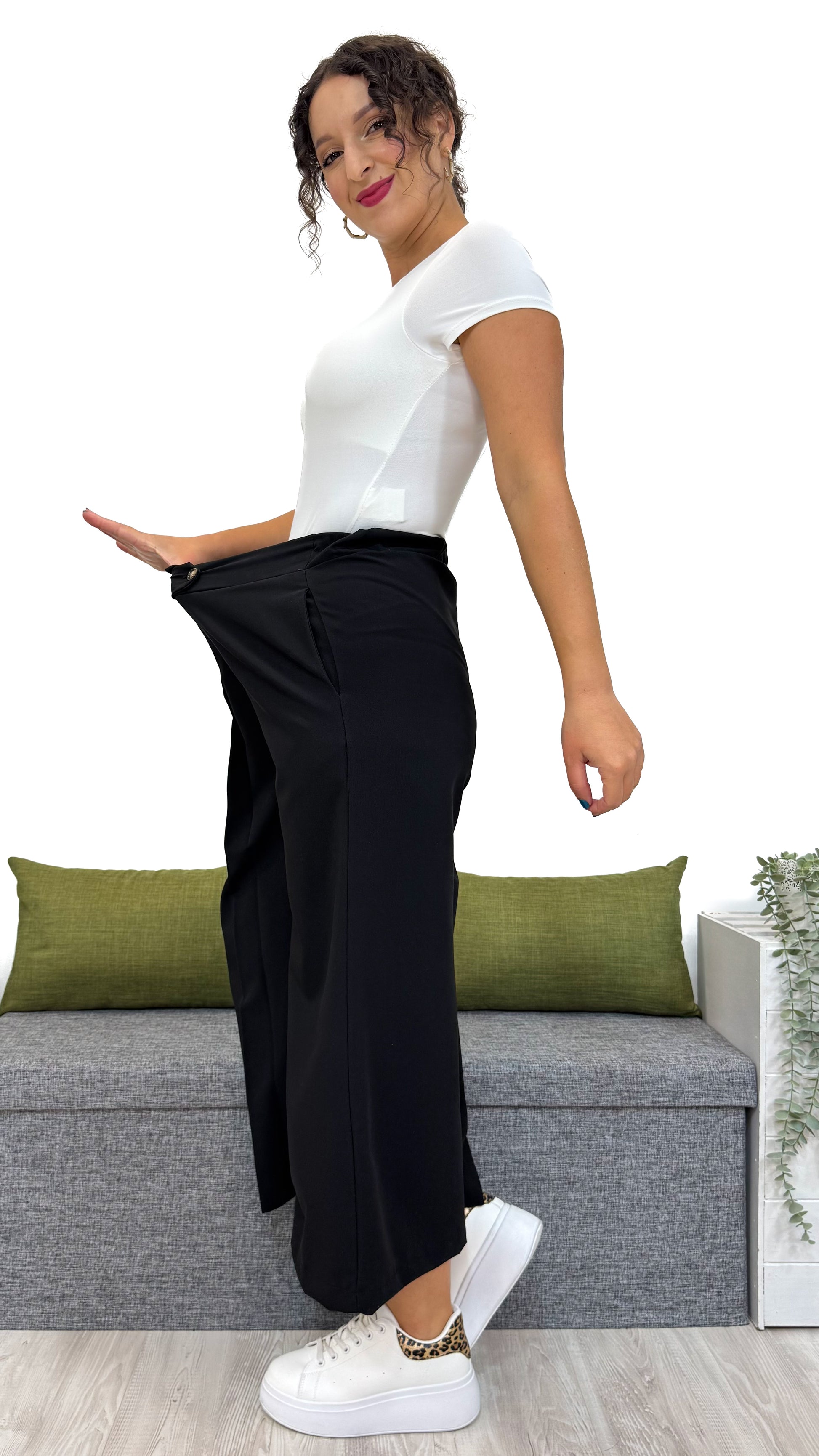 - Elastico sul retro: avvolge la vita con morbidezza, massima comodità senza rinunciare allo stile.