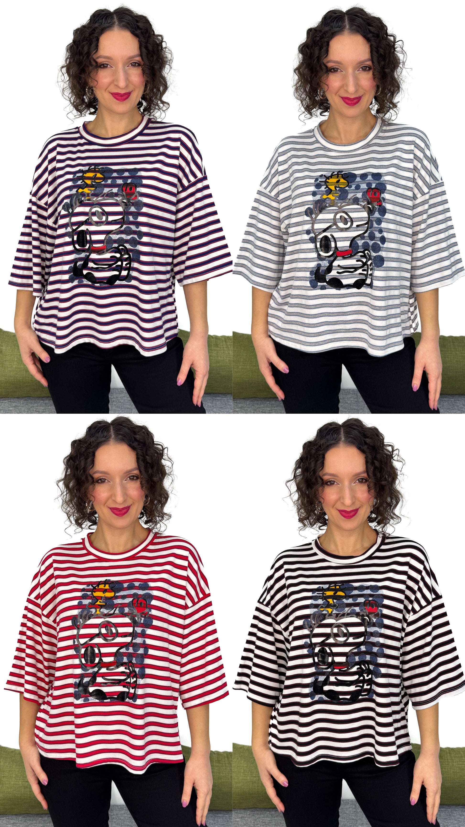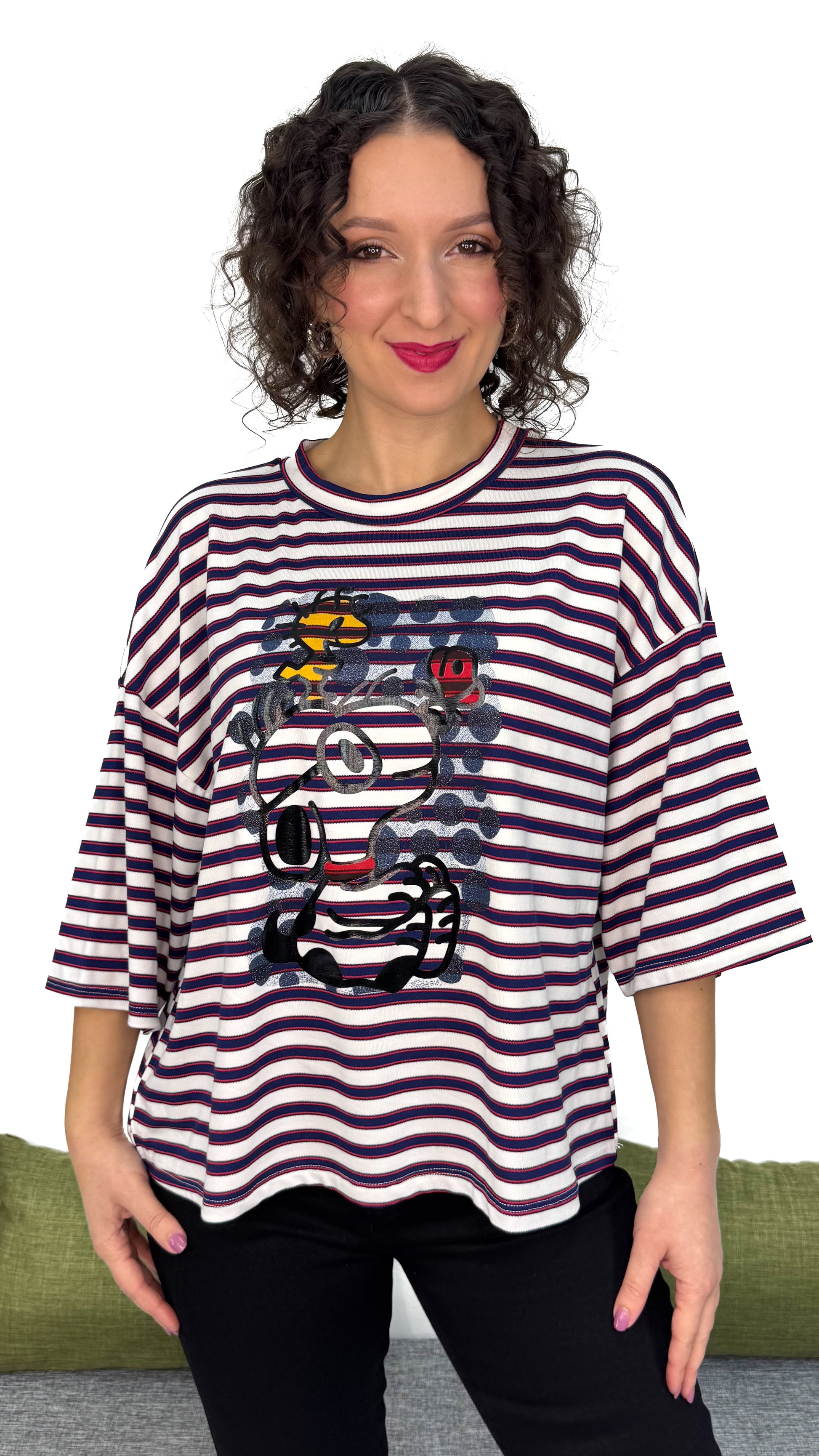 La t-shirt a righe di Snoopy è il mix perfetto tra stile casual e personalità.